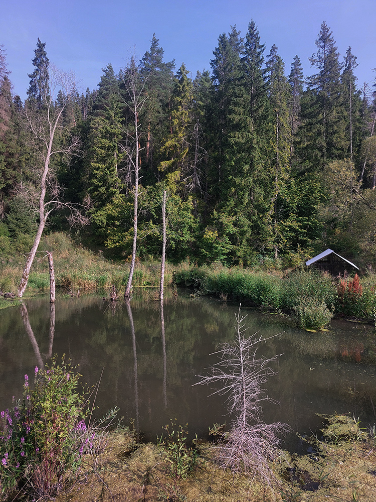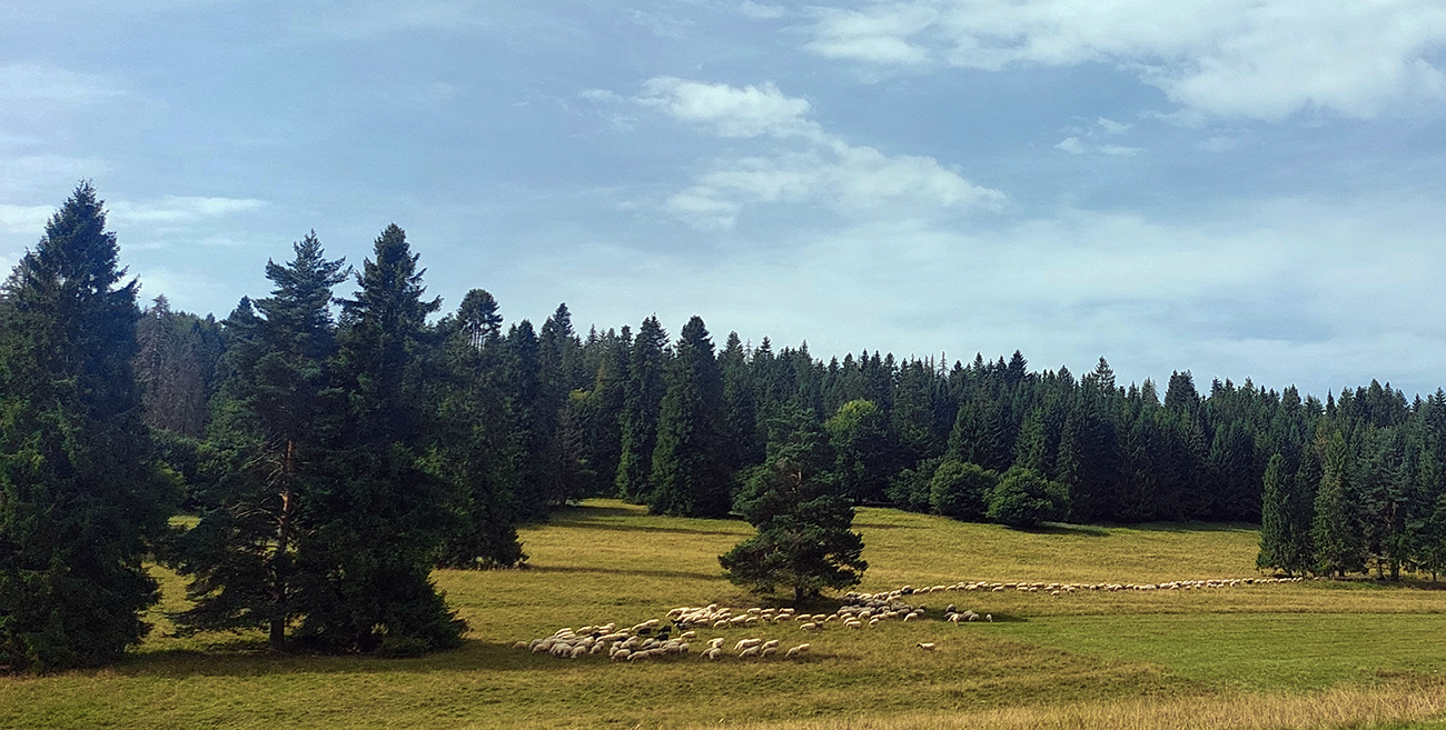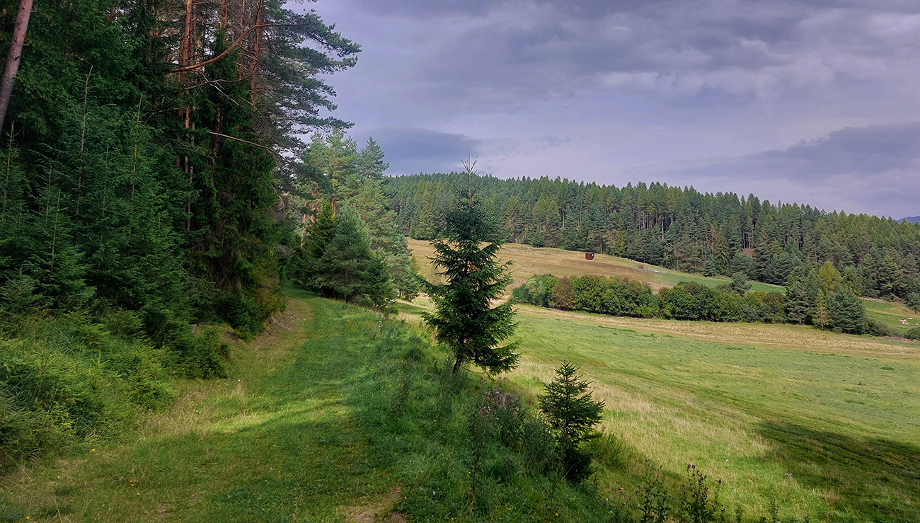 Panorámy začali na veľkých lúkach pred Šuňavou – najprv sa raz nesmelo ukázala Kráľova hoľa na juhu, potom už ale tie „ozajstné“ Tatry na severe, ako som postupoval k Važcu po rozhraní lesa a lúk. Najkrajší úsek celého dňa.