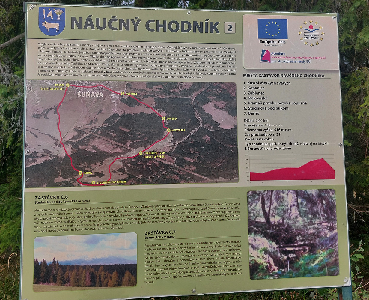 Podrobný opis je zbytočný, viac povedia fotky, tak len stručne k jednotlivým úsekom, navzájom odlišným. V tom prvom po Šuňavu ešte moc tatranských panorám nebolo (len jedna na úvod za chrbtom), zato veľa pohodlných lesných ciest na rozjazd – najprv dolinou poza Smolník, potom (po krátkom a strmom prejazde horizontu) Veľkou aj Malou Lopušnou dolinou. Pred Šuňavou najvyšší bod trasy, jediný nad 1000 m, a vlastne preklopenie zo Spiša do Považia, z povodia Hornádu do povodia Váhu.