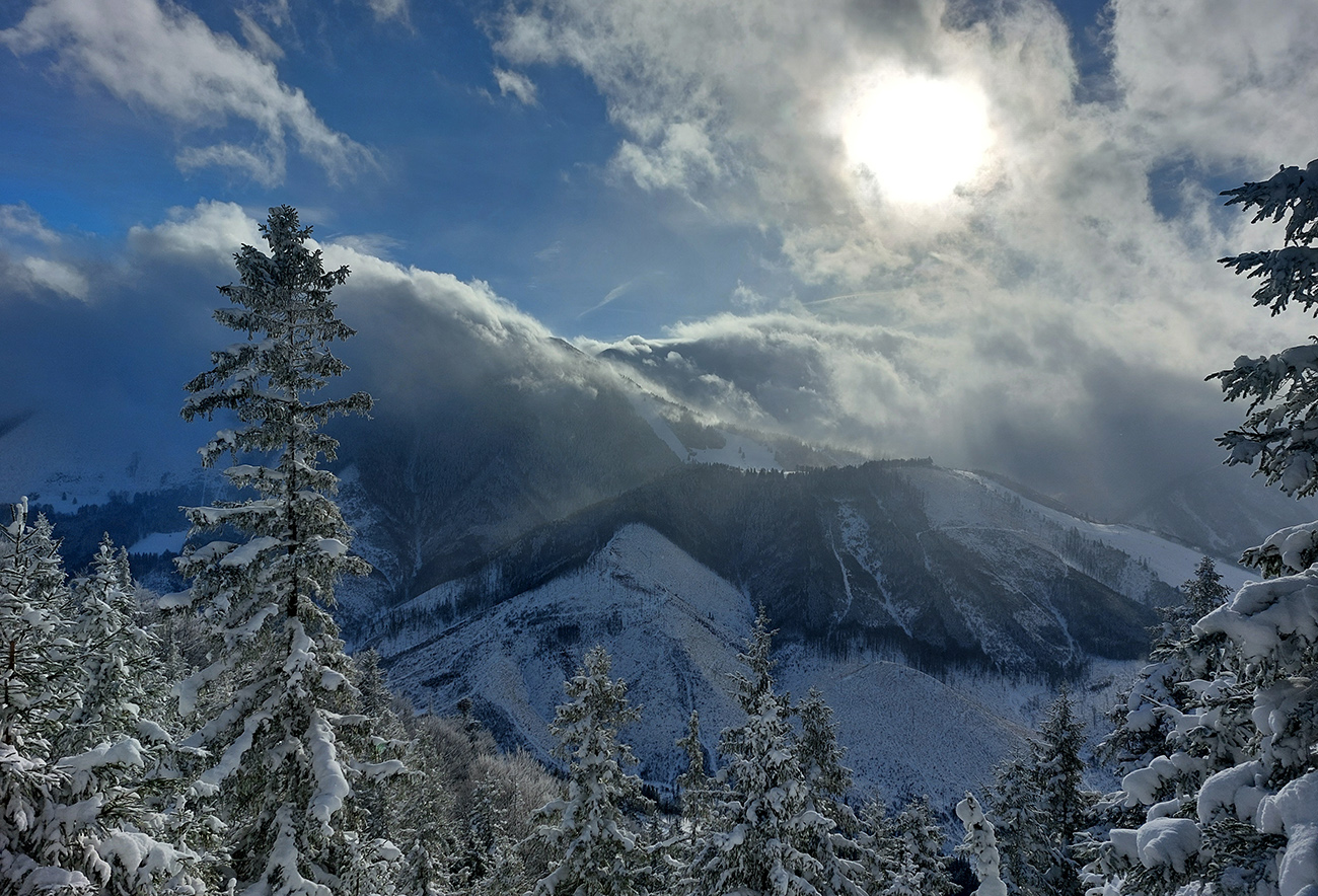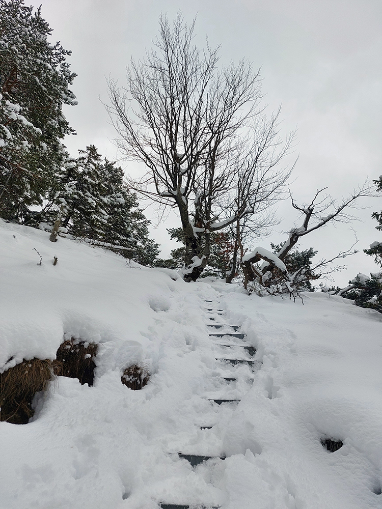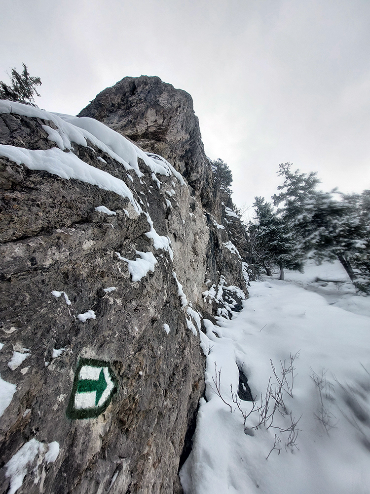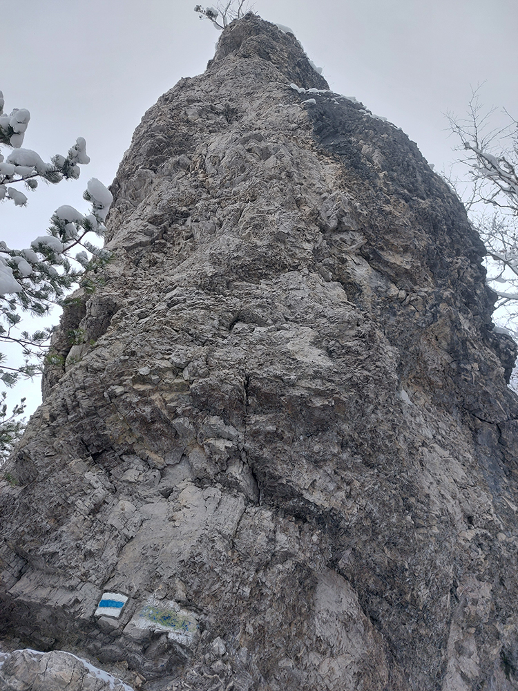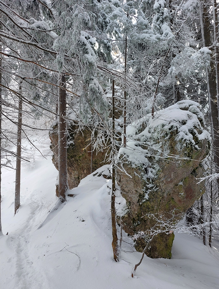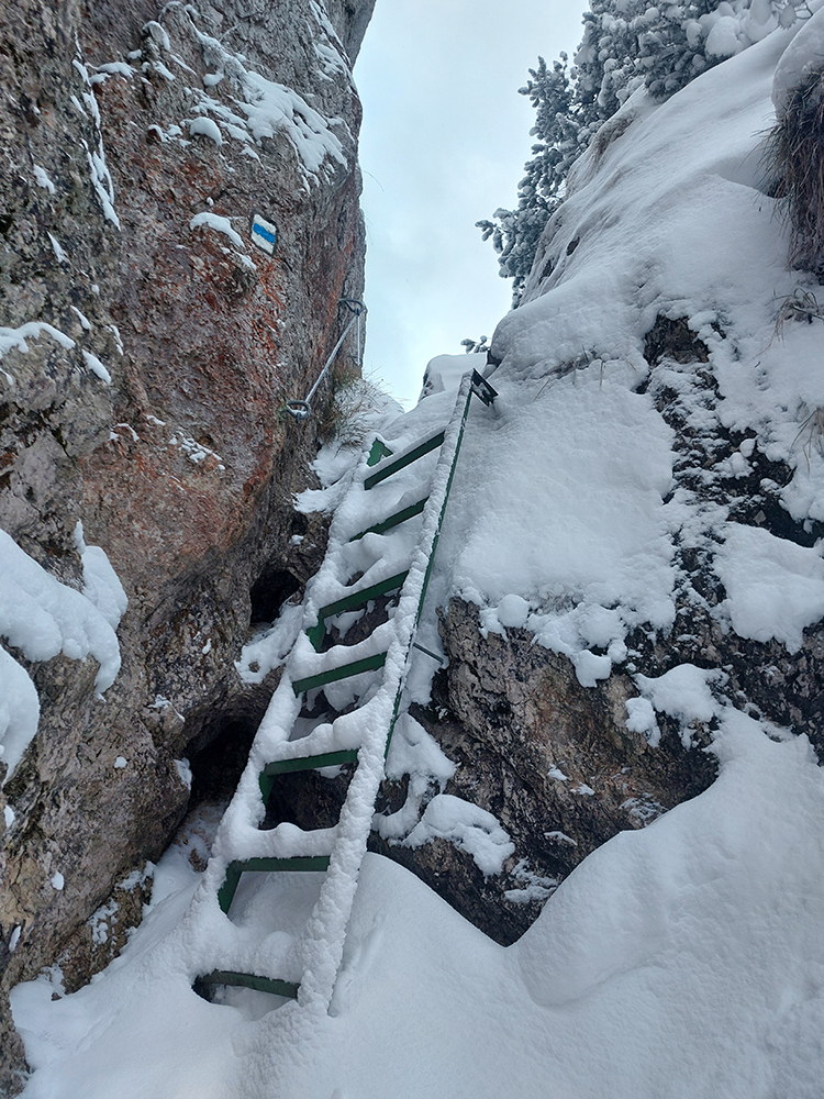 Zostup strmo dole do Tiesňav ešte krajší, ale vďaka tomu čerstvému páperiu bez základu aj šmykľavejší. A často vôbec nevieme, do čoho pod tým snehom stúpame. Retiazky a schodíky ukryté pod perinou moc nepomáhajú, skôr zavadzajú. Ale sivobiela bralnatá krajina naokolo je úchvatná.