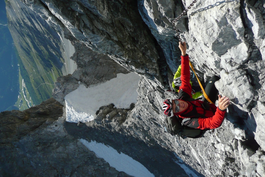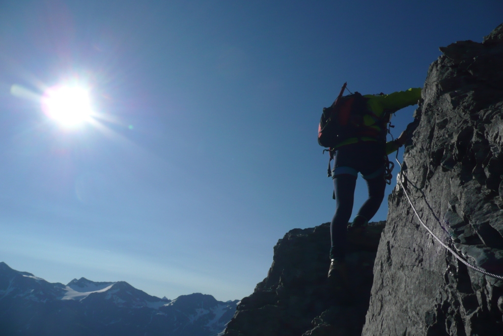 Od Payerhütte vedie cesta vpravo od hrebeňa rozbitým terénom. Náročnejšie výšvihy sú zaistené reťazami. V najstrmšom úseku, kde reťaze vedú takmer kolmou stenou sa aj cvakáme o reťaz cez slučku. Čisto pre istotu. Kvôli voľným kameňom je dobré mať aj prilbu.