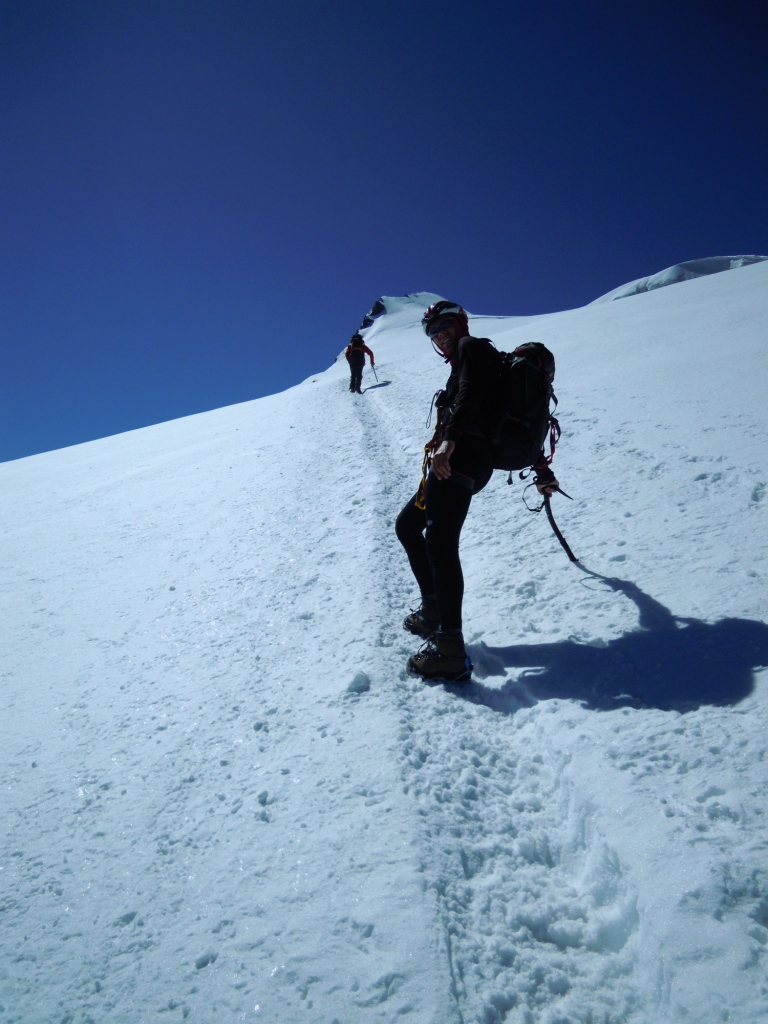Potom to bolo už len šliapanie v úžasnej páľave hore miernym svahom. Prechádzame aj popri dvoch naozaj veľkých trhlinách. Niečo po dvanástej sme na vrchole. Takže zo Suldenu 7 a pol hodiny s prestávkami. Martinove 4 hodiny sú naozaj brutálny čas. Ale som spokojný, lebo ešte včera večer som vravel, že ak nevyjdeme do dvanástej obeda, tak to otáčame. Na vrchole je to veľké Slovensko-České stretnutie, keď mnohí práve doliezajú Hintergrat.