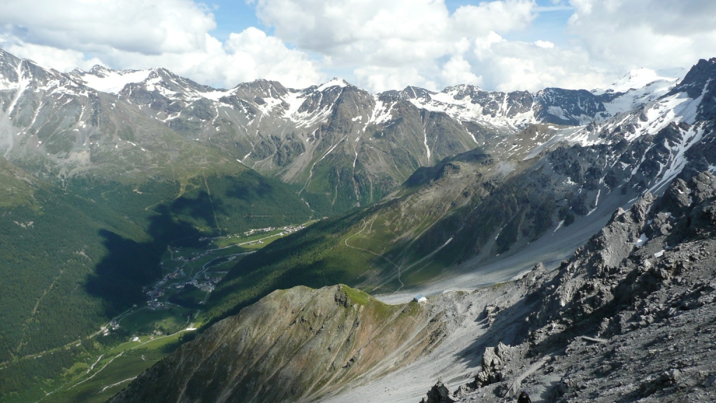 Pobolieva ma koleno a zastávky a najmä tá na Taberettahütte to len zhoršujú. Medzi chatami prichádza kvôli tomu kolenu kríza a napadá mi, že tam dnes ani nevyleziem. Azda prvýkrát v živote ma takto bolí koleno. Len nesmiem zastavovať, lebo potom bolí viac. Na Payerhütte sme o 7.15. Moje časové plány vychádzajú s odchýlkou do 5 minút. Odkedy sme na hrebeni, výhľady sú parádne. Nikde ani mráčka, Wildspitze, jazerá pri Passo Ressia a hlavne pohľad na cestu na Passo Stelvio je super. Rozoznávame aj MTB chuťovku Goldseeweg, užívame si krásny deň na správnom mieste.