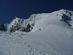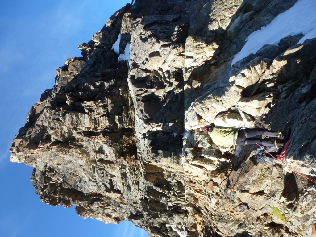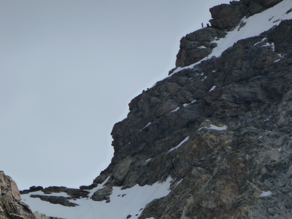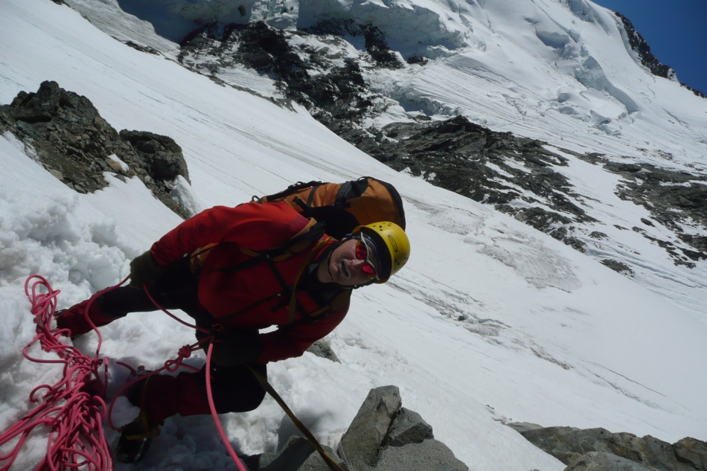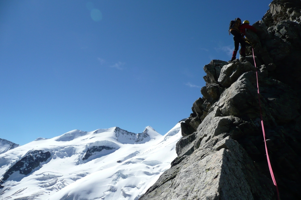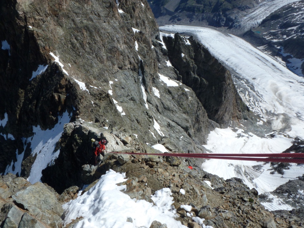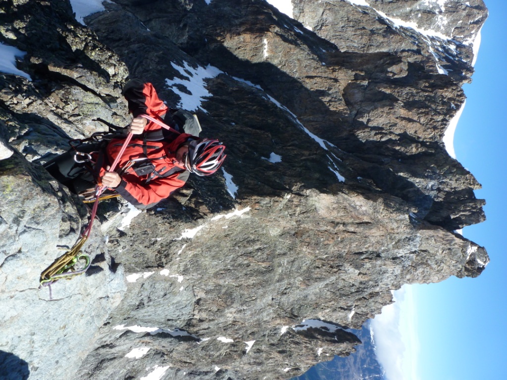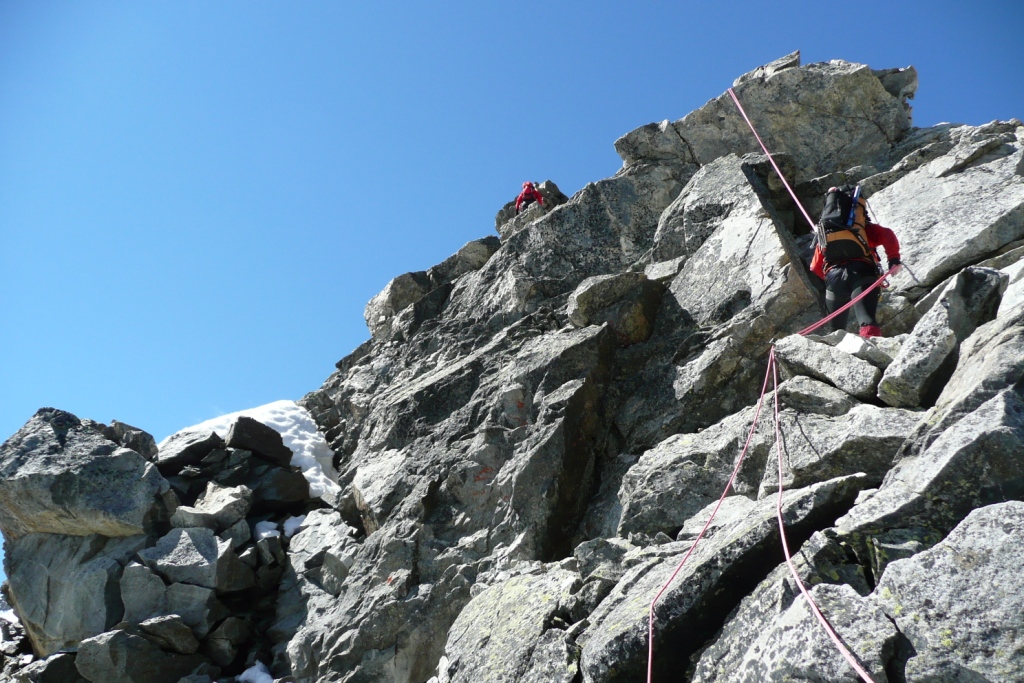Skalný hrebeň bol teda vcelku príjemný a prichádzame na miesto, kde sa zľava obchádza firnovým svahom skalná veža, za ktorou už začína samotný Biancograt. Máme ho priamo pred sebou, čas máme dobrý, sme pri sile. Vyzerá impozantne: väčší, strmší, ostrejší, exponovanejší než na fotkách. Vo firne sa boríme takmer po kolená. Z hrebeňa samovoľne padajú splazy a lavínky. Nulová možnosť istenia. Na fotkách to vyzerá, že sa tam dá stúpať aj na lyžiach, avšak netreba sa dať pomýliť. Naozaj to bude miestami až 55 stupňov, ako uvádza sprievodca. Na tom hrebeni ak sa potkneš alebo sa rozhodneš povoziť na lavínke, neprežiješ to. Kým čakám na Jana, toto všetko sa mi ženie hlavou. Už desať ľudí vyšlo dnes pred nami hore. Pred pár rokmi, keď som nemal dve deti, by som prášil za nimi. Teraz človek už inak rozmýšľa. S heslom o živom poserovi a mŕtvom hrdinovi vravím Janovi, že by sme mali otočiť. Jano je extrémny lyžiar bez záväzkov, tak jemu to ani nenapadlo, avšak rozumné argumenty pre návrat drvivo valcujú roztopašnú túžbu po vrchole. Rozmýšľanie o návrate sa mení na zľahčovanie negatívneho. Racionálne fakty, ktoré by potvrdzovali že sa nám nič nemôže stať, stále neprichádzajú. Prežívajúce nehorázne rodinné šťastie mi nedovoľuje podstúpiť toto riziko. Časy sa menia, myseľ človeka sa mení, ja nie som horolezec. Tento výstup nie je pre vehatečkárov.