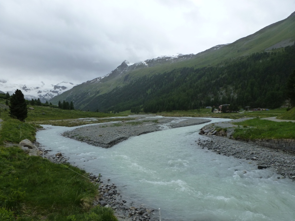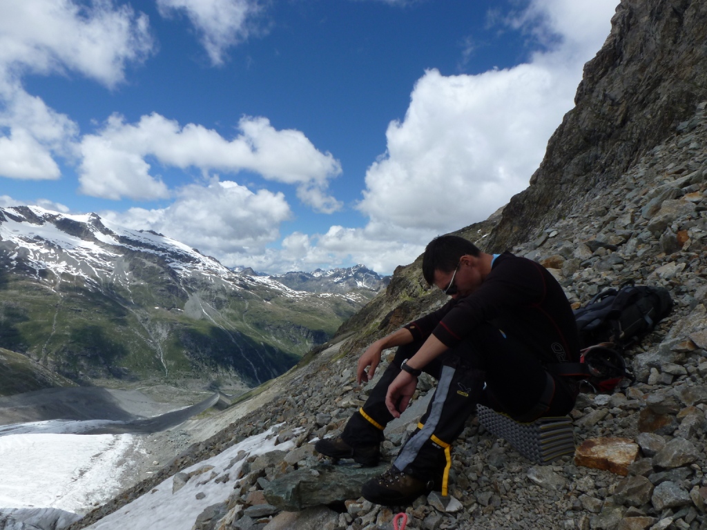 Výstup na chatu dolinou Roseg nám v neustálom mrholení trvá celú večnosť. Zaujímavé sledovať, ako vďaka činnosti ľadovca eroduje svah a padli mu za obeť aj niektoré časti chodníka. Kúsok pod chatou sú spravené krásne plošinky pre stany, doplnené o tabuľu so zákazom stanovania. Neviem, nakoľko vážne to treba brať, ale nedovolil by som si postaviť tam stan. Toto jedno vo Švajčiarsku neznášam. Samé zákazy! Ak niekto viete, či to kontrolujú, a ako riešia prípadné porušenia, dajte vedieť. Aj tak stále mrholí a nemáme stan. Chata je parádna. Veľmi moderná. Vraj nebolo „very clever“ prísť bez rezervácie. Ale miesta je aj tak dosť. S Alpenvereinom 23eur, bez neho 33eur za noc. V asi dvadsaťpäťposteľovej izbe sme my dvaja s Janom a štyria Chorváti. Po príjemnej debate o kadejakých kopcoch, ich plánoch na Broad Peak a potom, čo s nimi Jano dokonca našiel aj spoločného známeho horského vodcu z Tatier, ideme spať.