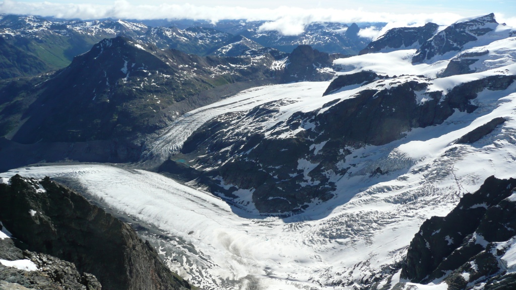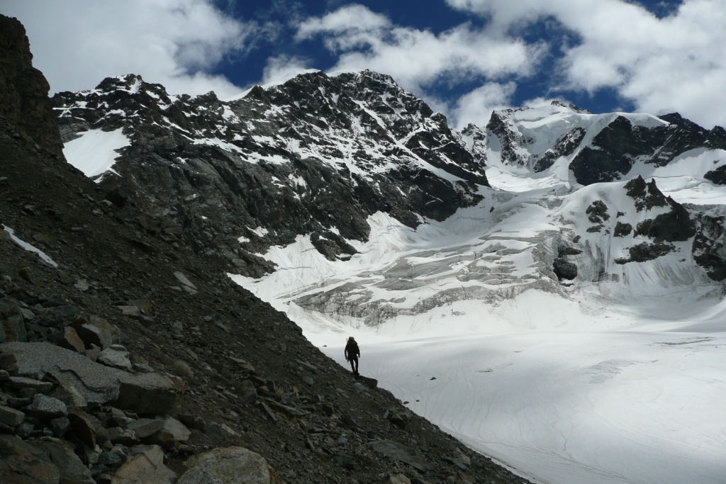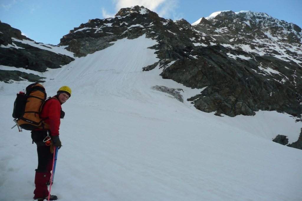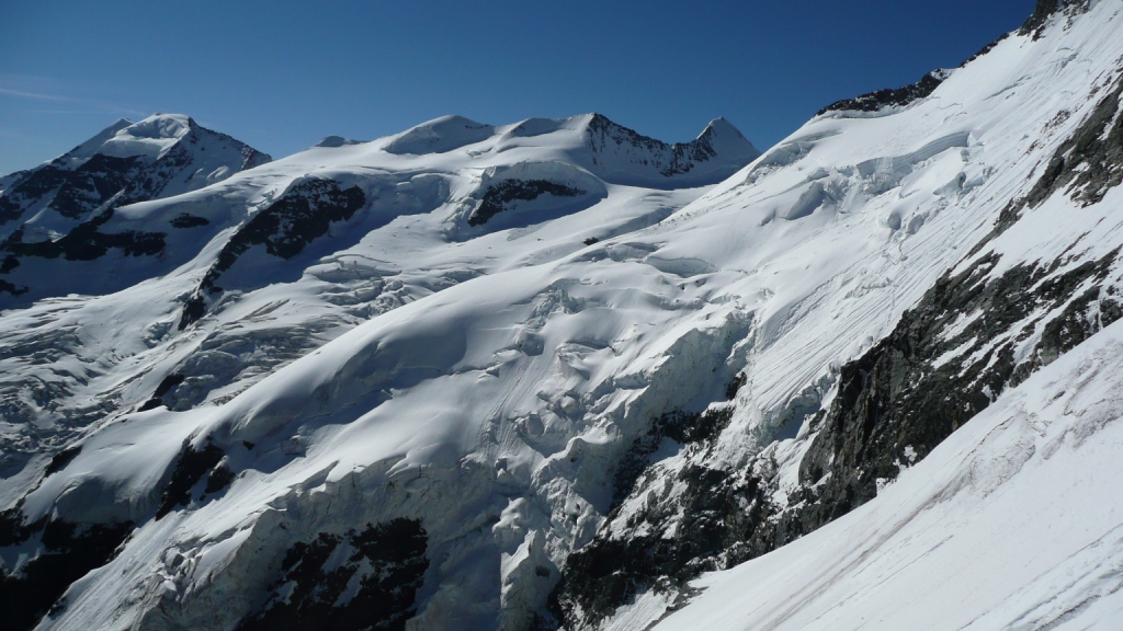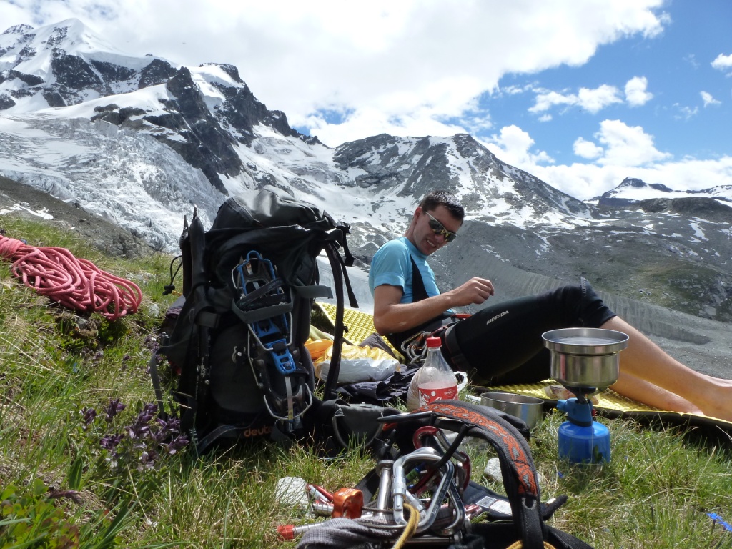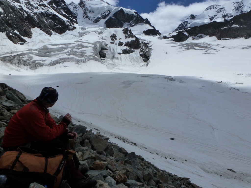 Chata je 2583 metrov vysoko. Ráno vyrážame ešte za úplnej tmy, niečo po tretej hodine, ako druhá partia. Cesta vedie ponad ľadovec úbočím hory Piz Morteratsch chodeckým, mierne exponovaným terénom. S brieždením prichádzame na ľadovec a dáme si pauzu, aby sme sa naraňajkovali. Cesta ľadovcom je príjemná, lebo jeho sklon je minimálny. Až na záver je výšvih do sedla Prievlusa 3430m, ktorý má asi 45 stupňov. V sedle sa charakter výstupu mení. Stúpame trojkovým skalným hrebeňom. V skale sú nity, ktoré samozrejme využívame na istenie. Stále sa pokladáme za vysokohorských turistov, nie za horolezcov, preto si nedovolíme postupovať súčasne. Je to krásny, veľmi exponovaný hrebeň. Svahy z neho padajú hlboko na rozpraskaný ľadovec. A na tom ľadovci sa stále niečo deje. Praská, láme sa, padajú seraky. Ľadovce pod Bellavista sú úžasne divoké, rozľahlé, nepriechodné. Pri pohľade na ne mi začína byť jasné, prečo sa nezvykne v deň výstupu aj zostupovať. Hoci by sa to časovo dalo stihnúť. Cesta cez ľadovec je prosto dlhá, šlo by sa to už po obede, kedy je sneh mäkký a niektoré miesta stoja v dráhe padajúcim serakom.