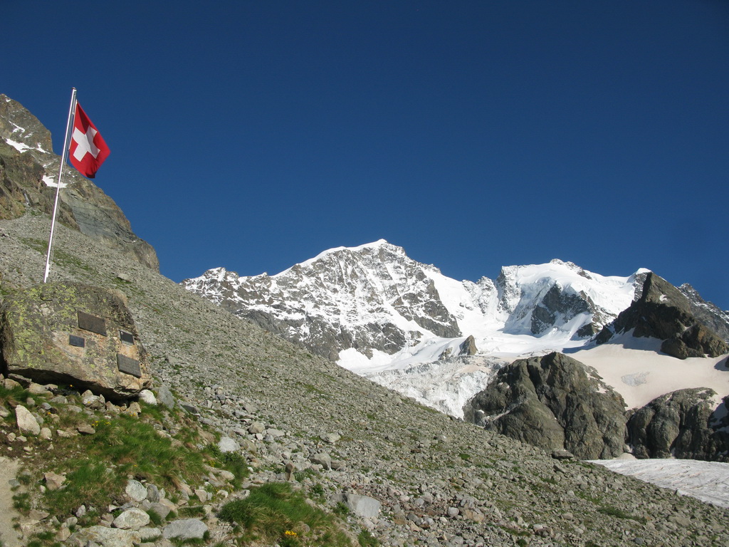 Chata Tschierva 2573m. - Piz Bernina 4049m. prevýšenie hovorí jasne: 1500 výškových metrov, ale pozor nejde sa stále priamo dohora, je to jednoducho štreka. Na nete som sa niekde dočítal klebetu o tom, že slávny Hermann Buhl kedysi uzatvoril stávku ako rýchlo vybehne hore. Žiadne bližšie údaje som nenašiel, iba že stávku vyhral a trvalo mu to vraj 3 hodiny.
