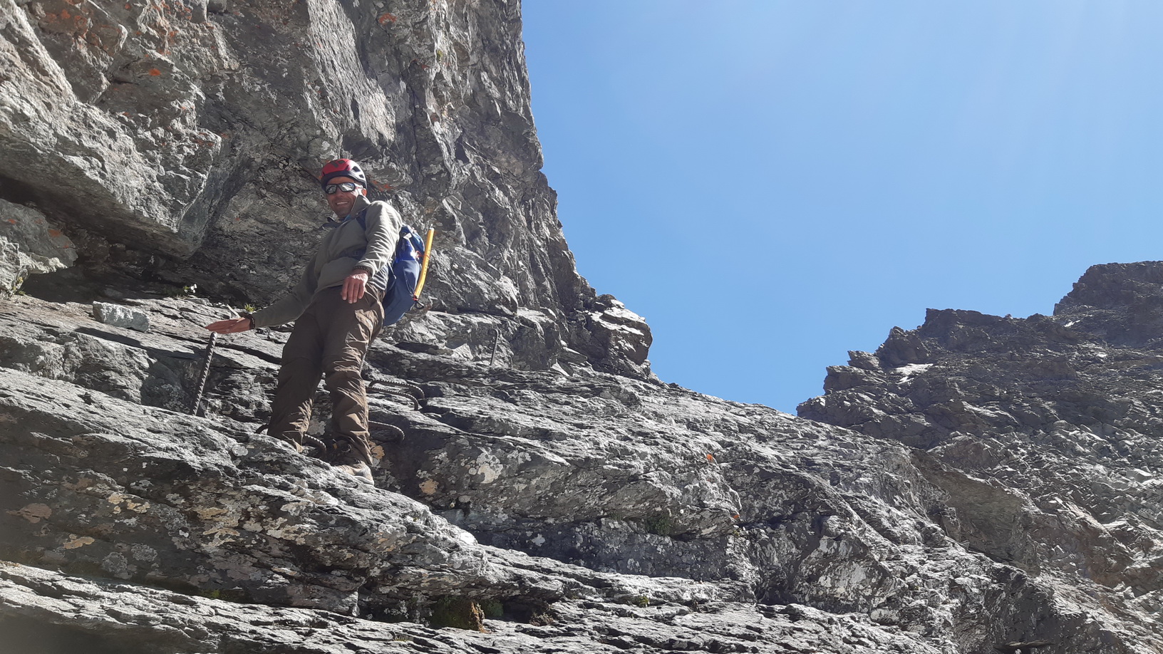 Zabezpečená trasa nie je klasickou ferratou, nie je na nej oceľové lano ako na štandartných ferratách. Jej začiatok je dobre označený na okraji ľadovca pri okrajovej trhline. Keďže väčšina ľudí smerujúcich na Bianograt prechádzajú tadiaľto ešte za tmy, tak sú tu aj odrazky. Po prvých metroch na skale nasleduje pomerne dlhý traverz, až kým neuvidíte železné kramle v skalnej stene.