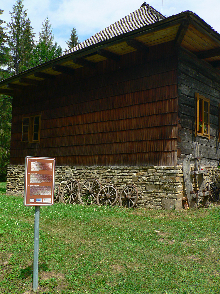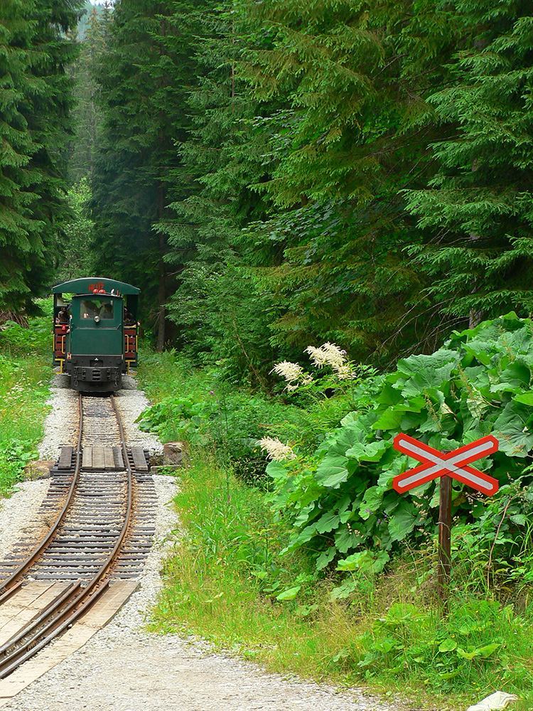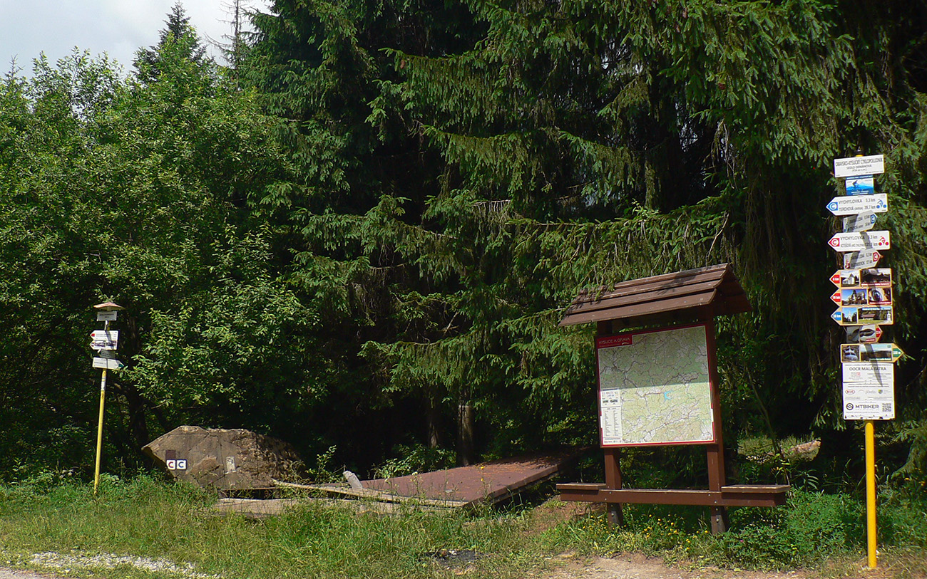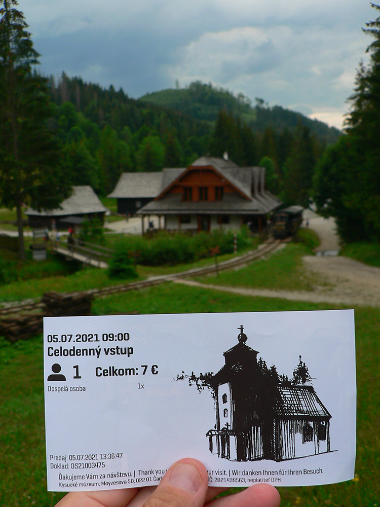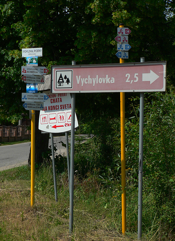 Vstupujem „do civilizácie“, lebo okrem miestnych z osady sa okolo vrcholovej stanice oboch lesných železničiek moce vždy veľa turistov. Neobišiel som samozrejme rozhľadňu, ale cestou dole do Vychylovky som naopak veľmi rýchlo odbočil z červenej – načo sa po nej trepať až dole po asfaltke, keď sa dá po zvážnici uhnúť doprava a zísť k prvej úvrati (Chmúra) a odtiaľ zhora do skanzenu... Vstupenku som si kúpil, ale až na konci prehliadky :-) Potom už len zo dva kiláky pešovania na Rycierky, na autobus. Inak netreba ísť ani po ceste, dá sa aj po železničke, ak je akurát pokosená :-)