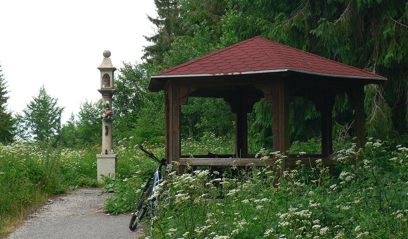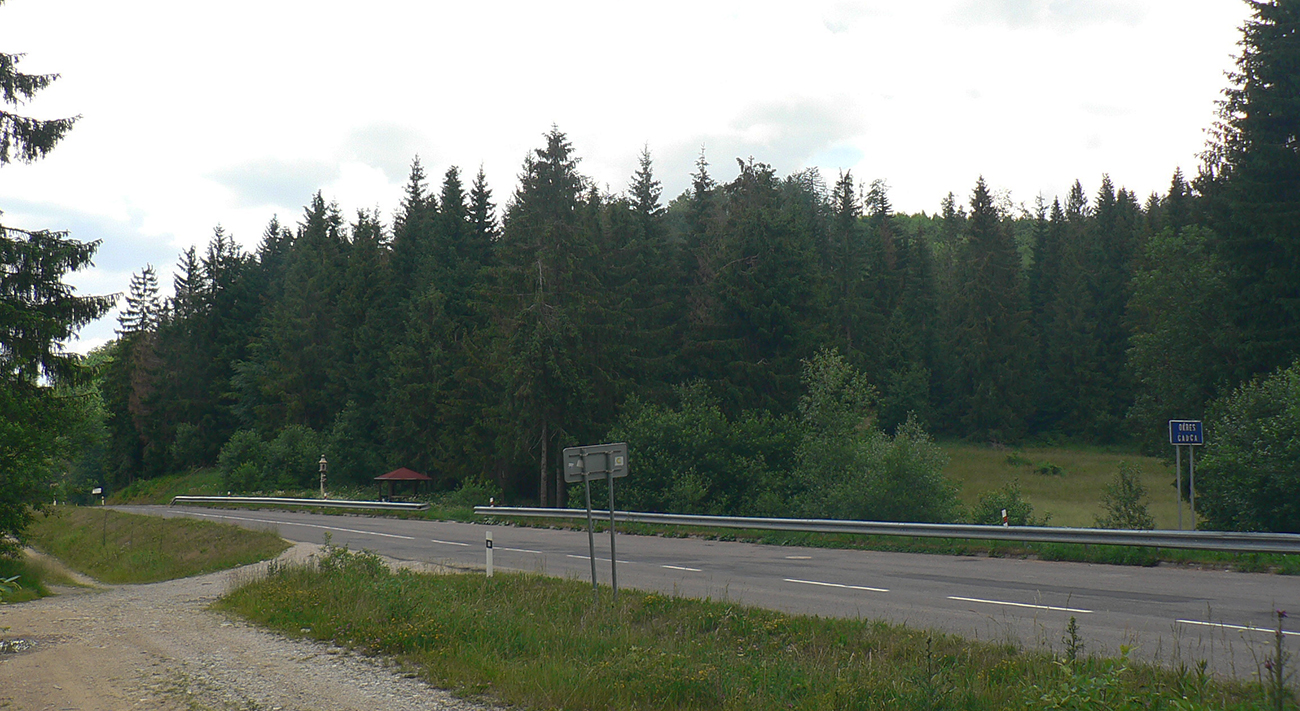 Jamy, to je vrchol stúpania hlavnej cesty, hranica okresov NO a CA aj hranica dvoch CHKO, božie muky a altánok pre pocestných. Za cestou značka chvíľu stúpa po zvážnici a je zreteľná, ale akonáhle zatočí doprava, stratí sa v tráve, kroví a bordeli po ťažbe. Pár stoviek metrov takto a potom už je to zas v pohode, až do konca. Les redne a postupne sa otvorí do rozľahlých lúk okolo osady Demänová.