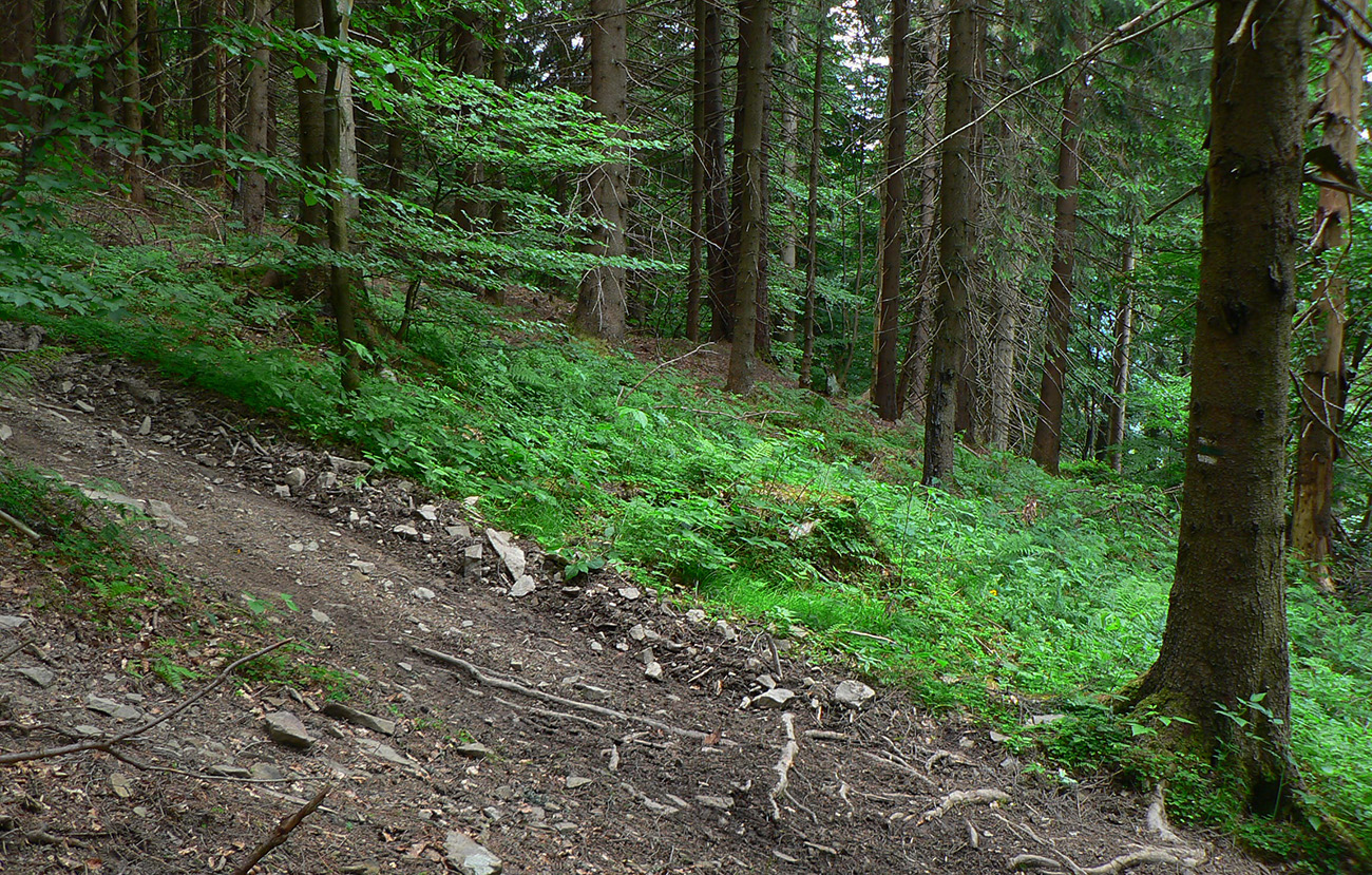 Hrebeňom Oravskej Magury vedie len krátky úsek – do Sedla pod Okrúhlicou. Celkom pekný lesný chodník (preliezky len sem - tam) a jedna veľká čučoriedková lúka ako bonus. Potom ale zostup z hrebeňa na sever je jedna poriadna tragédia – po ťažbe konármi zahádzaný alebo v tráve neviditeľný chodník. Značky síce sú, ale dosť riedko - vidno, že tadeto moc ľudí nechodí. Ešte aj ten kúsok zvážnice je vyspravený dákou vysokopecnou struskou s hranami ostrými ako nôž. No fuj.