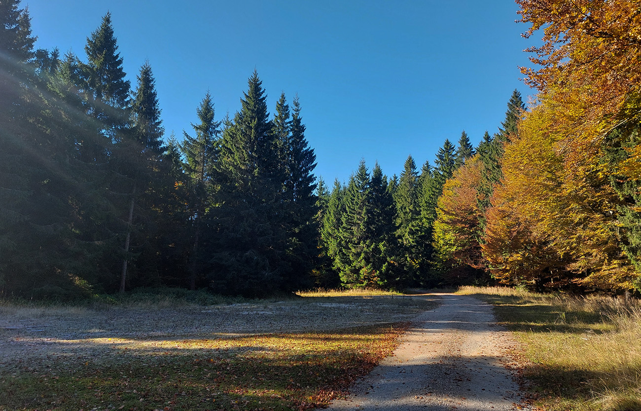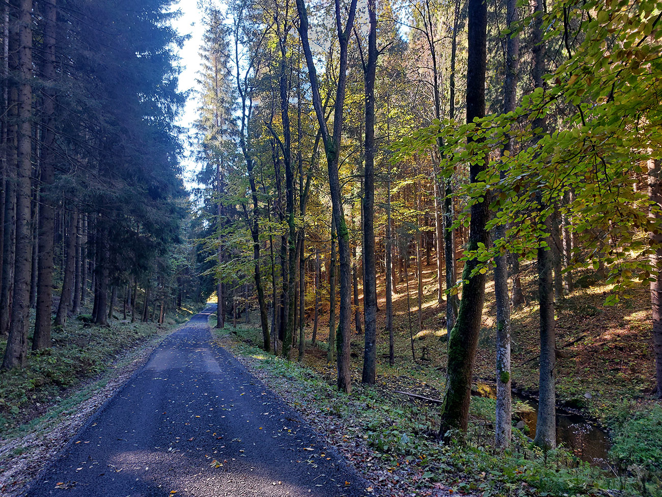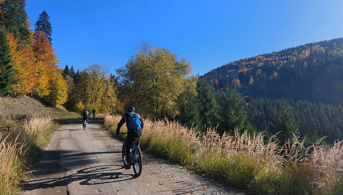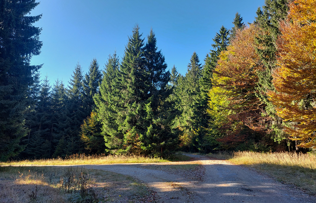 Prvá etapa od vlaku cez dedinu a popod lom do doliny Čiernej vody, ponad vodárenskú nádrž, popri chate Obrázok a Dirhabské sedlo až po zelenú značku pod sedlom Tunel bola ozaj výlučne po zvážniciach. Boli aj „strade bianche“, aj nejaký ten asfalt, aj mäkké, machom a ihličím vystlané cesty, všeeetko možné, ale všetky dobré, nerozrýpané, aj pre bajk. A farby dookola sýte, radosť behať/jazdiť.
