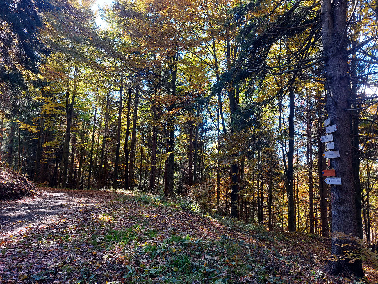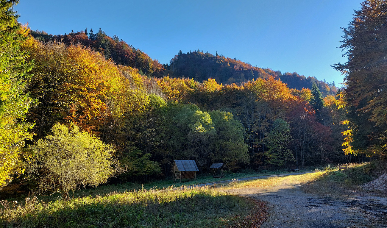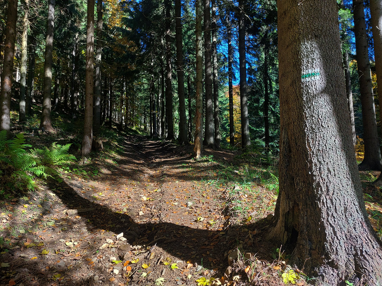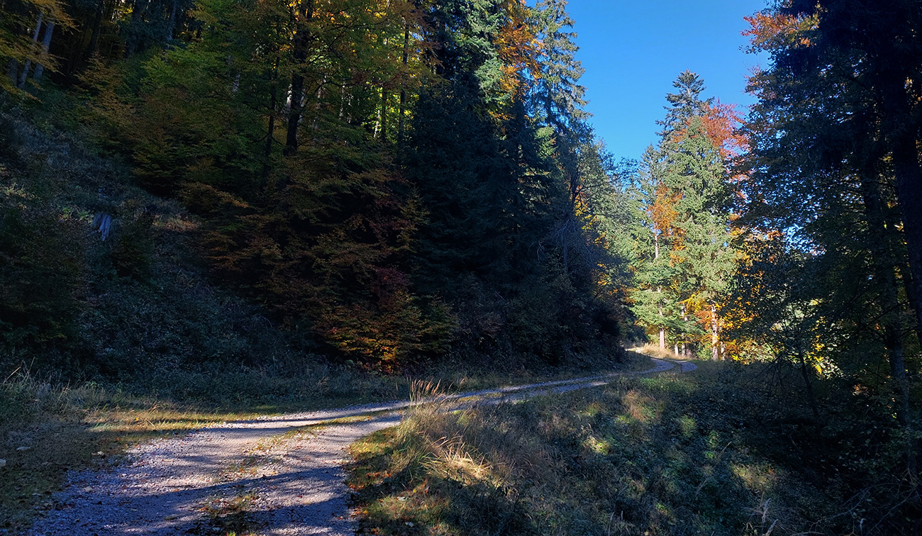 Prvá etapa od vlaku cez dedinu a popod lom do doliny Čiernej vody, ponad vodárenskú nádrž, popri chate Obrázok a Dirhabské sedlo až po zelenú značku pod sedlom Tunel bola ozaj výlučne po zvážniciach. Boli aj „strade bianche“, aj nejaký ten asfalt, aj mäkké, machom a ihličím vystlané cesty, všeeetko možné, ale všetky dobré, nerozrýpané, aj pre bajk. A farby dookola sýte, radosť behať/jazdiť.