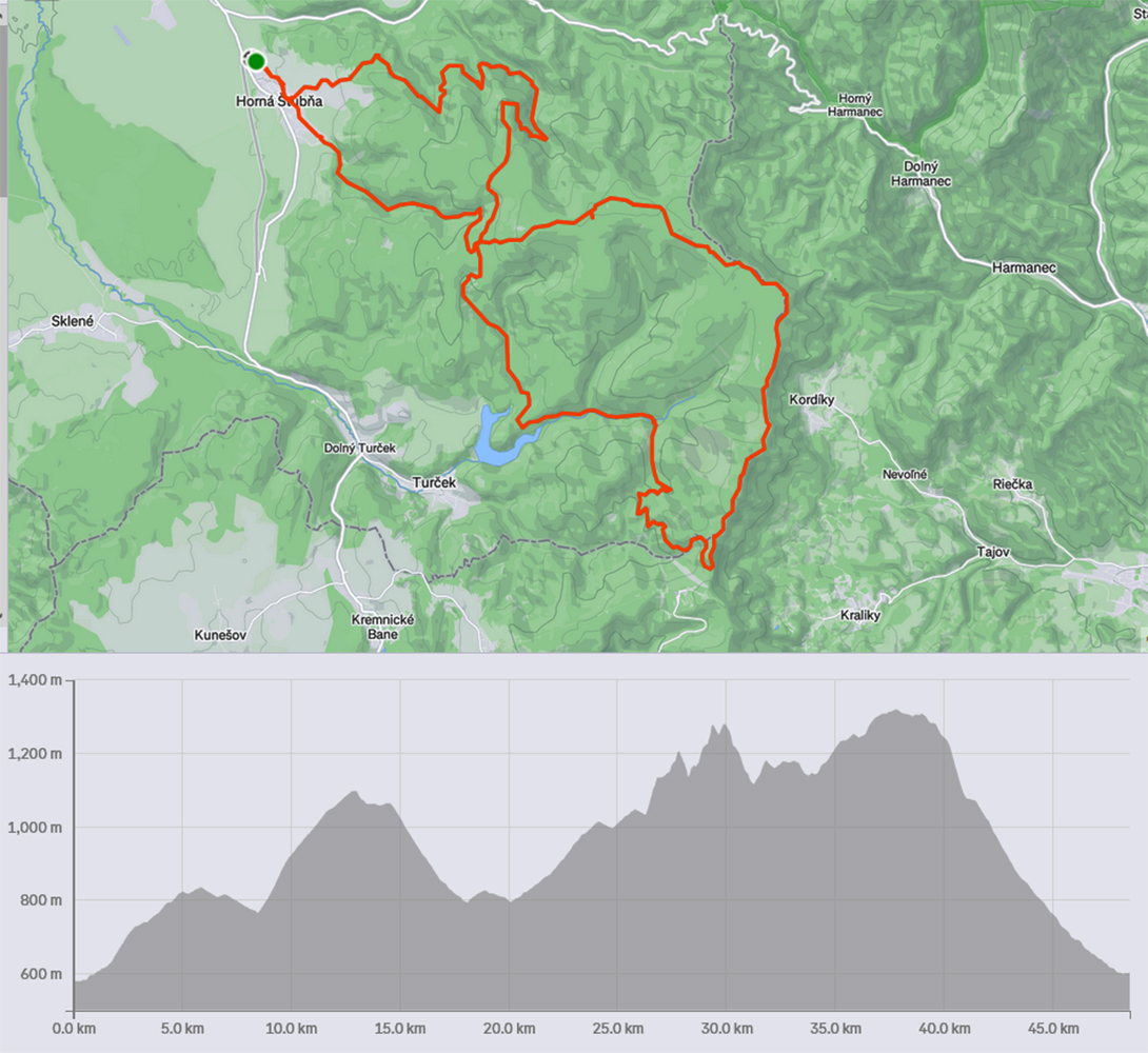 Zas je tu ten čas, keď aj na zvážniciach a rúbaniskách je to estetické, lebo októbrovo plnofarebné. A lesy na severe Kremnických vrchov nie sú vydrancované a ciest je tam na mrte a keď už mám týždenník na vlak do BB, tak zas zo Štubne do Štubne, len som pár kilákov pridal oproti prvému dielu ( TU ) a opáčil zas iné cesty a chodníky. Alebo teda skombinoval, lebo po väčšine z nich som sa už neraz motal. Vyšla z toho taká osmička, necelých 50 km (gpx je hore a približovacia mapa dole). Rozpisovať to celé nemá zmysel (lepší popis je pri fotkách v galérii), bolo to ozaj na 90% po hladkých lesných cestách, možno pre niekoho aj monotónne, ale fajný tréning a dosť pekných miest cestou. A po daždivej sobote sa vyjasnilo, teda aj primrzlo, chrumkavo sa behalo, dobré to bolo: