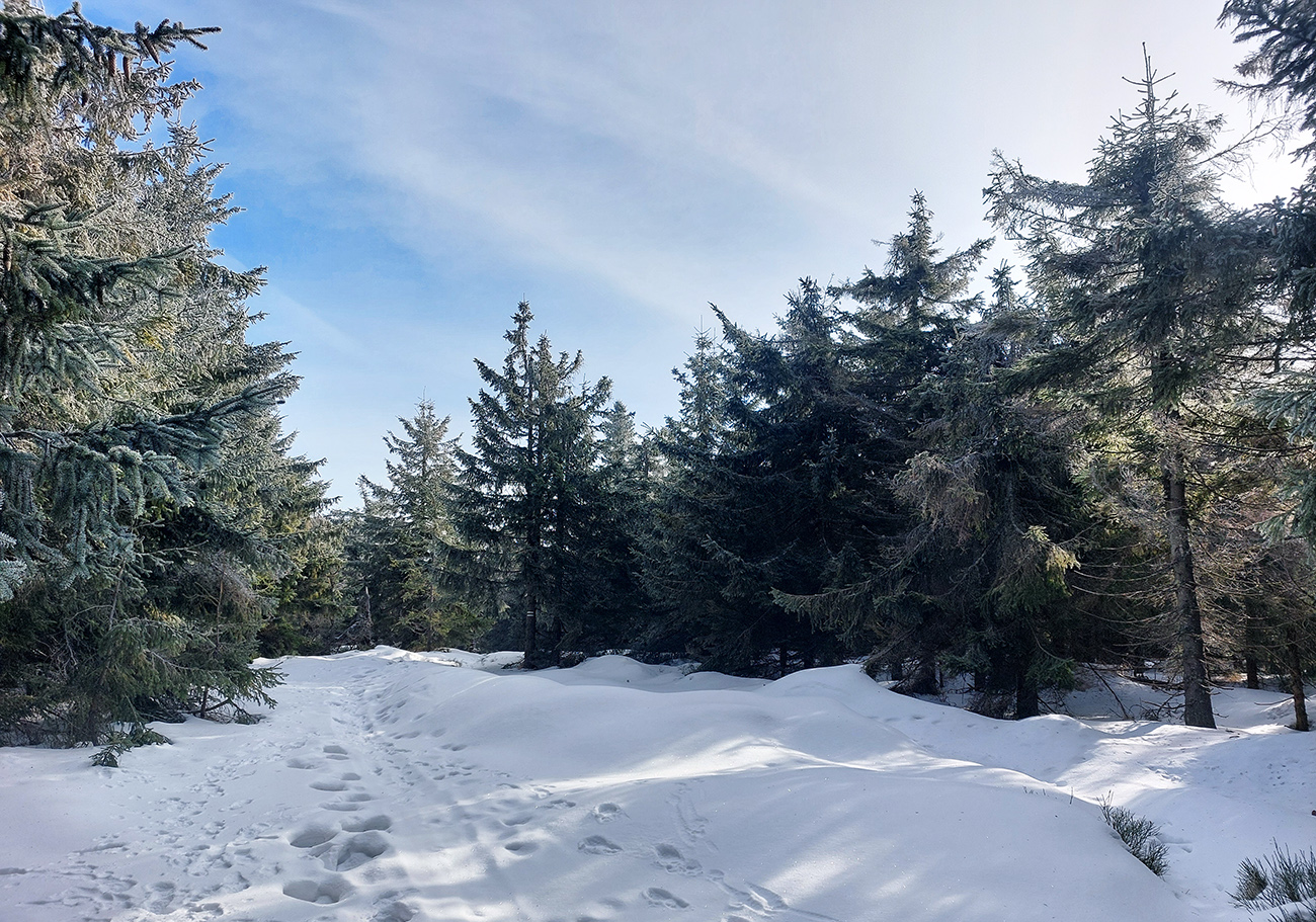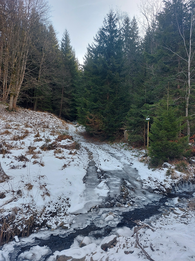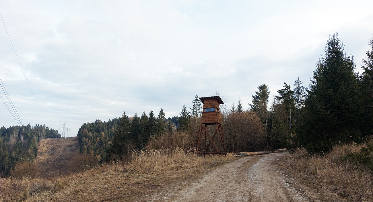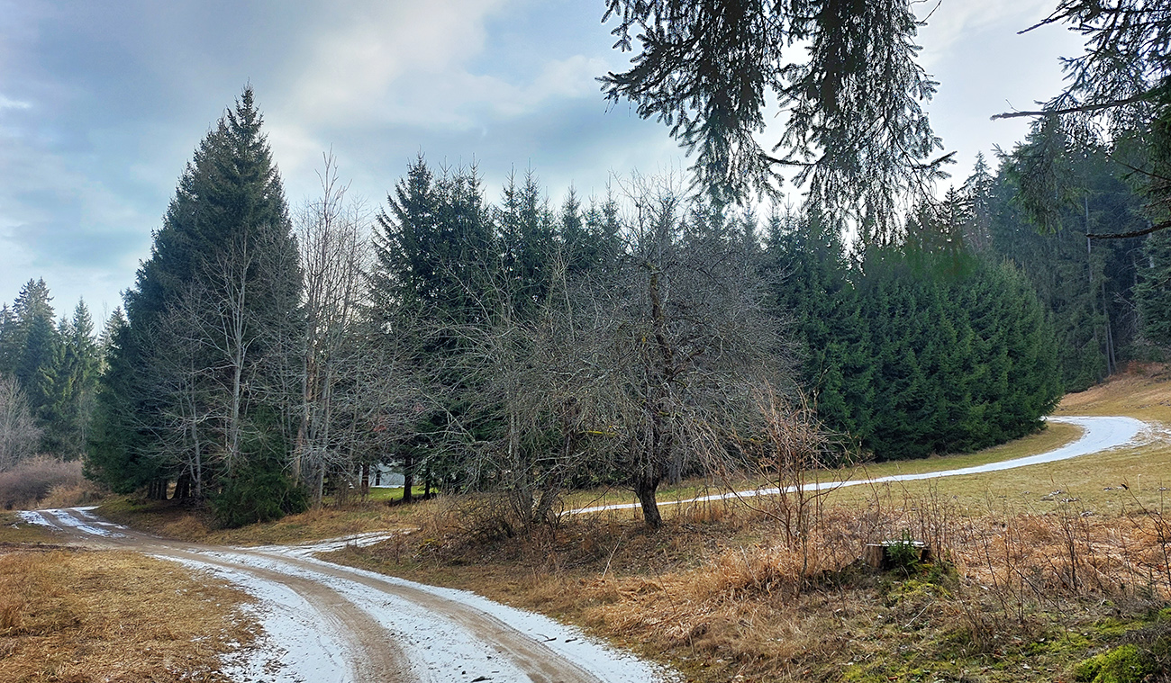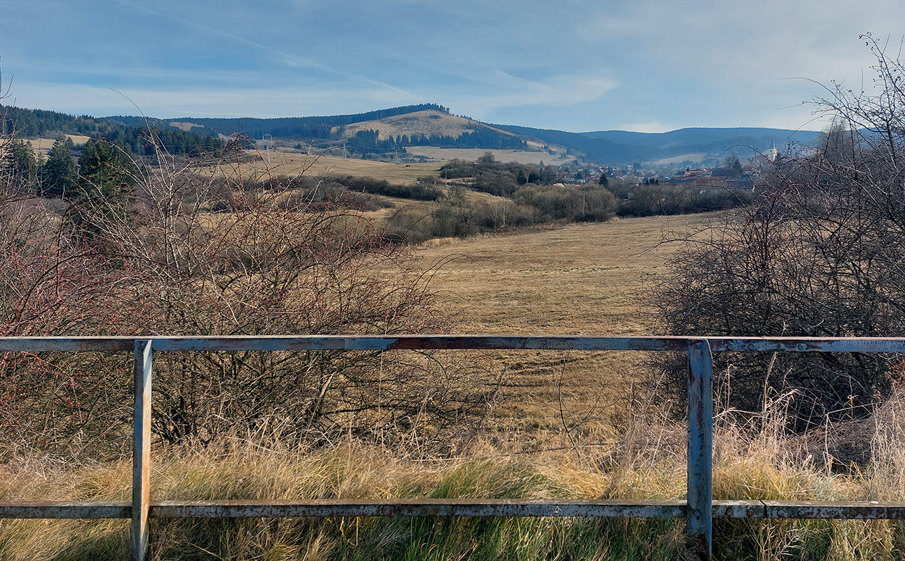 Najvyšší kopec Kremnických vrchov má síce 1319 m, ale je to zalesnený chrbát bez výhľadov a všetky cesty na tú „náhornú plošinu“ vedú lesmi, z veľkej časti hospodárskymi. Len hore je rezervácia. Zároveň ako pokračoval snehovo biedny február (skôr taký koniec marca), keď sa v noci vyjasnilo a všetko to zmrzlo, nechcelo sa mi lyžami dakde po ľade hrkotať, obul som trailovky. Vyšiel z toho okruh od vlaku k vlaku, z hororovej (Hostelovej?) stanice v Hornej Štubni. Samé zvážnice, len strmý záver výstupu na Flochovú od severu (po zelenej) po lesnom chodníku. Zároveň po poriadnom klzisku. Takže skôr tréning – pohodová vyklusávačka, iba za vrcholom, na jednom neprechodenom úseku lesnej cesty sa to trochu pod nohami borilo, inak ani na to prebáranie niet nikde snehu. A zvážnicové blatá pomrznuté a lúky nad dedinou suché, ani som nemal šancu sa zaprasiť. Takže spokojnosť, takto to vyzeralo: