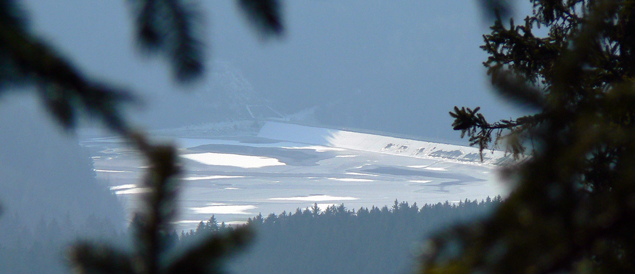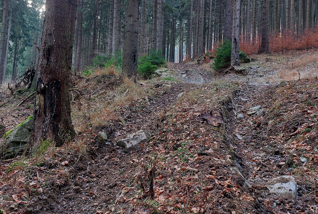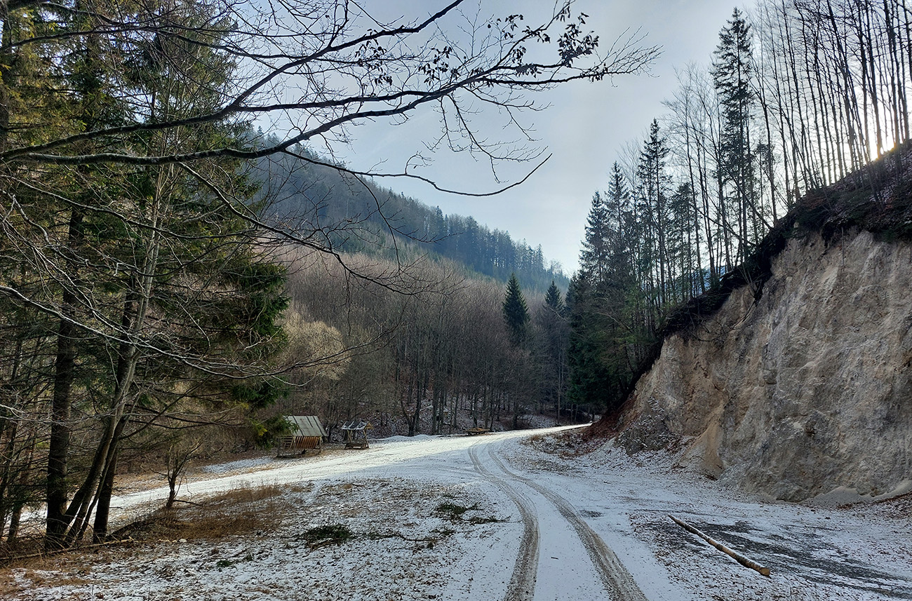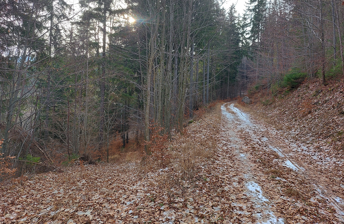 Ešte trochu prebárania bolo na aktuálne nepoužívanej ceste v obchvate bezmenného kopca nad Širokou dolinou, ale tá bude v lete skvelá pre bajk. Potom čím nižšie, tým viac šotoliny, samozrejme. A jeden či dva biedne priekuky pomedzi redšie stojace stromy – ku hrádzi vodárenskej nádrže Turček.