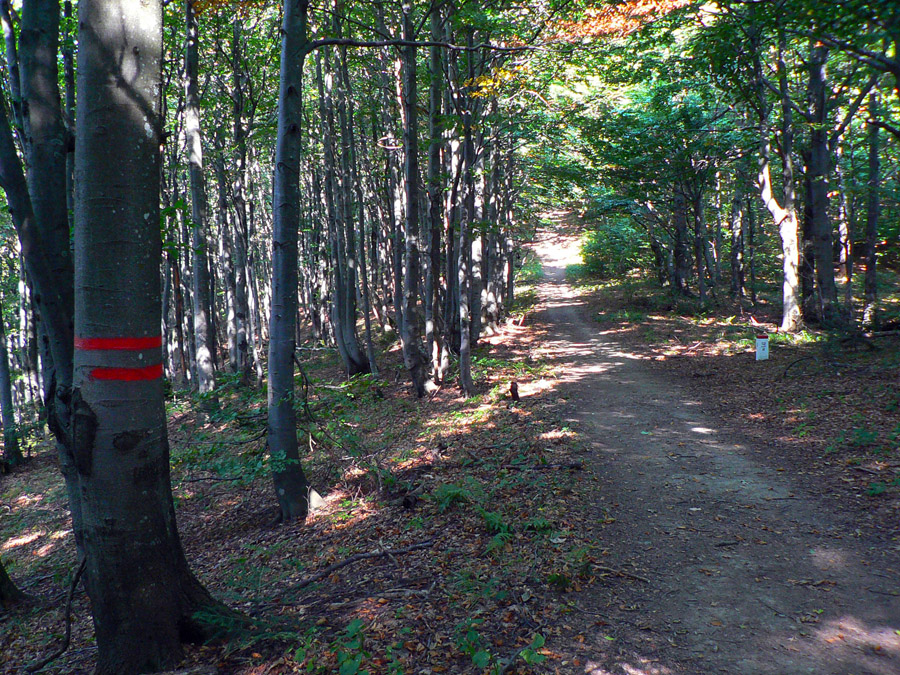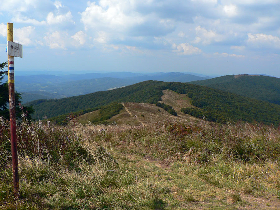 Nižšie v sedle je smerovka k prameňu pod svahom, ale ten je beznádejne suchý. Ten nasledujúci pod Pľašou už ani nejdeme obzrieť. Pľaša je posledný holý vršok s kruhovým výhľadom, potom až na Kruhliak je to prevažne lesom. A klesáme, takže aj keď sa nejaká tá lúka naskytne, stromy už sú vysoké, do diaľok nevidno. Satisfakciou sú černice, ktoré nahrádzajú vyššie rastúce čučoriedky. V dobrom čase sme sem prišli :-)