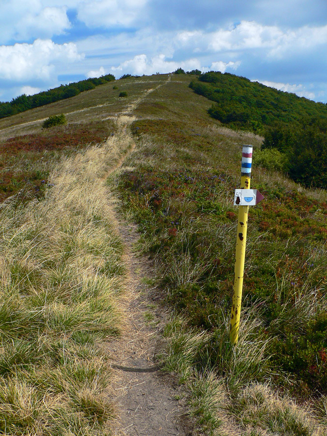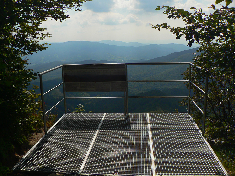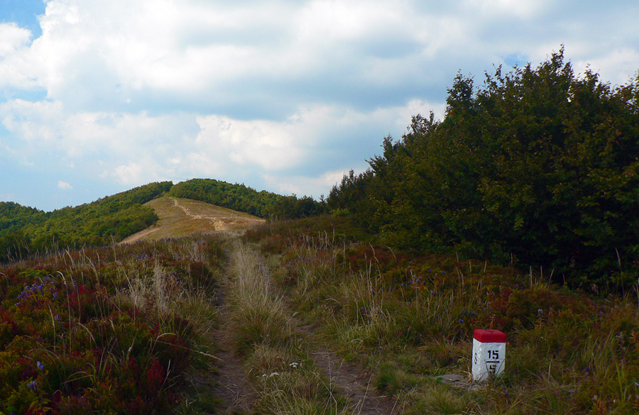 Tam sa najprv pokocháme novou a vyleštenou vyhliadkovou plošinou aj s panoramatickou mapou (na našej strane). Je nad strmým skalným zrázom, ktorý je v tomto „guľatom“ kraji dosť veľká rarita. Na vrcholových čučoriedkových poliach si nejaký chlapík trúfa oberať hrebeňom a podľa vybavenia sem na túru neprišiel - no, možno majú u susedov iné predpisy... Poliakov teraz dosť pribúda (už si to môžu zdola pekne zokruhovať), len sa divíme, že sú skoro všetci totálne naľahko. Niektorí nesú najviac tak mobil a okuliare :-)