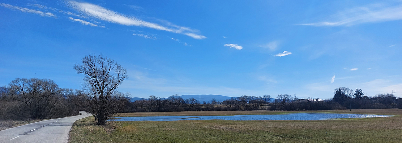 Ďalej sa cesta príjemne vlní po okraji polí a hrany terénu – dúfam len, že nebude moc zablatená traktormi (nebola). Vpravo dole v nive to zúrivo šteboce, život sa tam prebúdza do jari, škoda nepostáť a nezapočúvať sa. NPR Turiec, to je zas jedna rarita minimálne európskeho významu, so svojimi mokraďami, neregulovaným tokom a pestrosťou života ako niekde v dažďovom pralese: