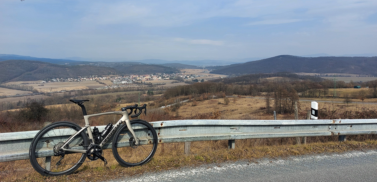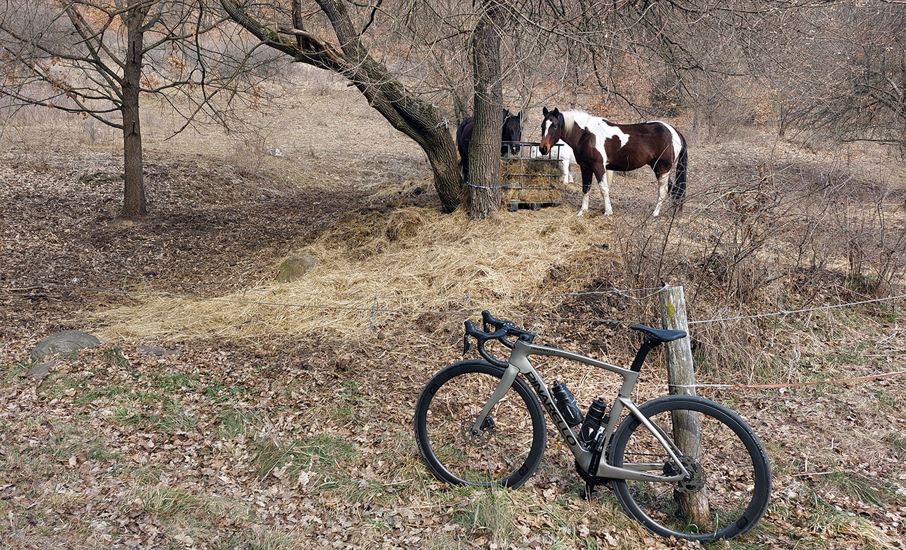 Víkend, počas ktorého fičala prvá ultrabežecká stovka v sezóne u nás (Letecká) bol hriešne suchý a teplotne príjemný, nedalo sa odolať – vytiahnuť cesťák na dlhší výjazd :-) Keď už som sa na Leteckú v nutnom veľkom predstihu neprihlásil s nádejou, že budem ešte lyže drať. A nie, že by som Pino už predtým párkrát nevyvenčil, ale to len okolo domu, tak nadišiel čas aj inde sa pozrieť. A že mám ten týždenník na vlak, odviezol som sa do BB a odtiaľ už po vlastnej osi obzerať kopčeky okolo Hrona na západ od Zvolena. Takže tých prvých a posledných 20 km si netreba všímať, to dôležité je v sľučkách na mape v okolí Budče, Tŕnia, Železnej Breznice, Hronskej Dúbravy, Ostrej Lúky, Brezín, Bacúrova a Dubového. Krajina pekná, aj keď ešte predjarne sivá, ale výhľady cykloturisticky pozitívne a asfalty fajnové, tak som sa ani nedivil, že som tam nebol sám: