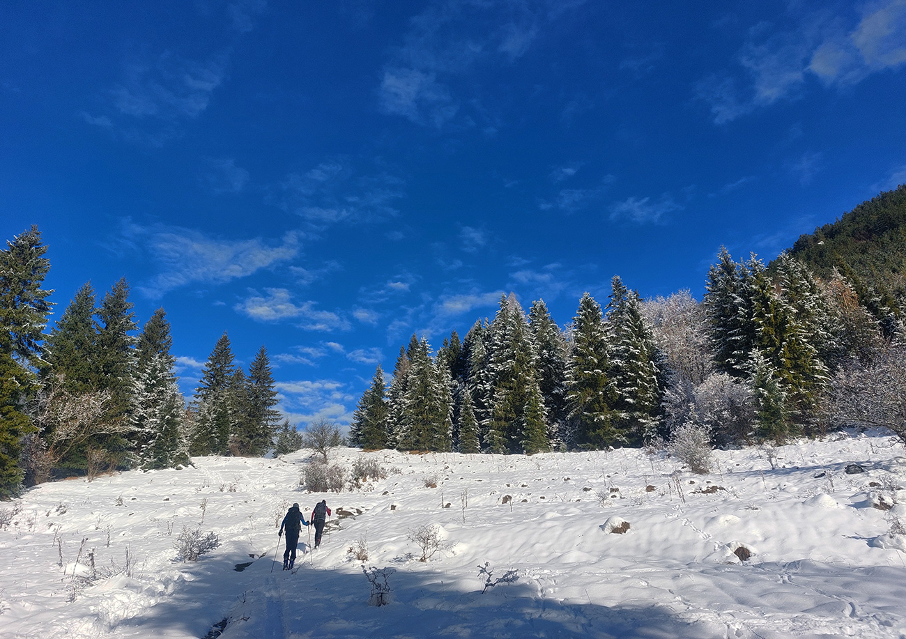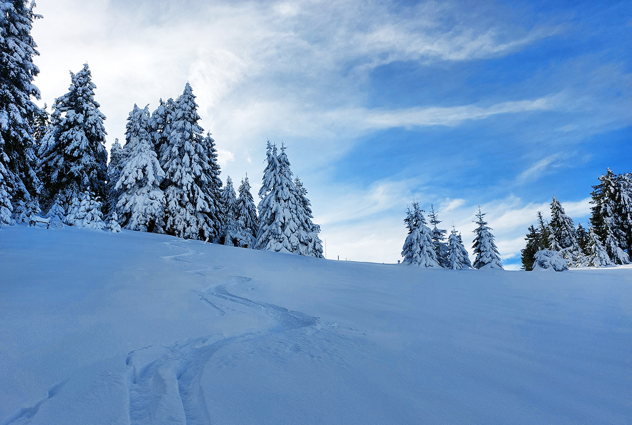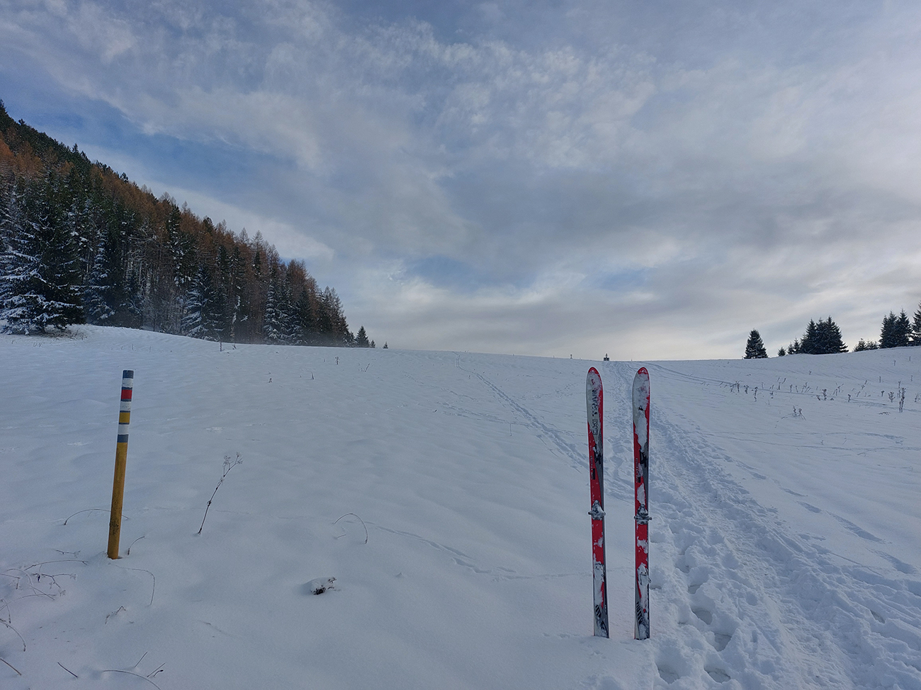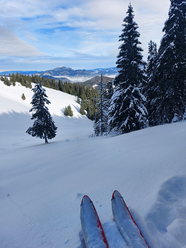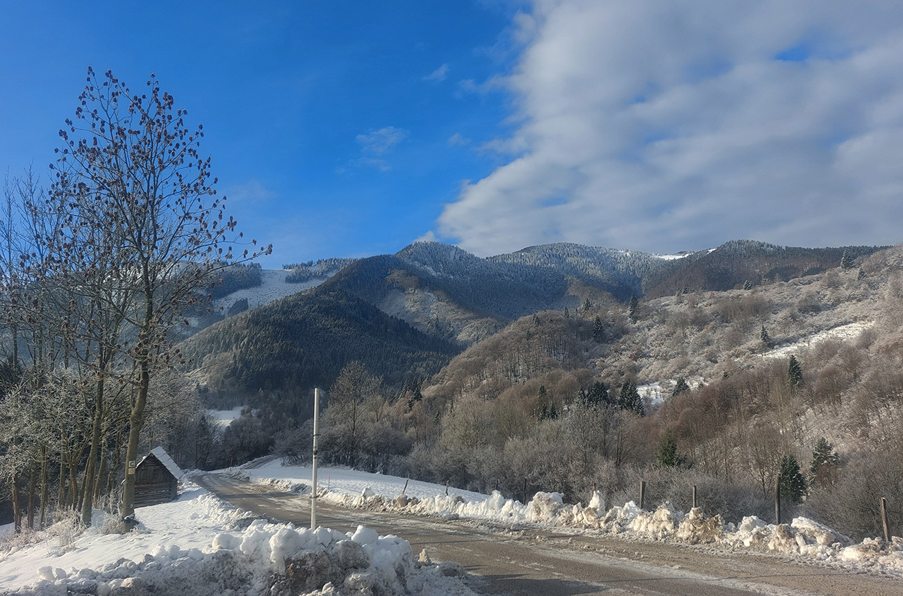 Podarilo sa zahájiť o týždeň skôr ako vlani, aj to je už úspech! A dalo by sa vlastne ešte o týždeň skôr, po prvom poriadnom snežení. Niekde, lebo veľké lokálne rozdiely ten navlnený snehovo-dažďový front priniesol po 20. novembri. Zámer bol ísť na Smrekovicu, lebo v dolinách snehu málo a ešte aj to zlízal lejak, nad lesom zúrila pri prechode frontu víchrica a vydrela všetko do ľadu. Zato Smrekovica a okolie presne v tej ideálnej medzivrstve, dokonca na severných svahoch sme nesmelo dúfali aj v nejaké lyžovateľné prášky na zmrznutom podklade. V Ružomberku snehu nula, ale v hlave ešte zneli správy, ako práve pred týždňom v Bielom Potoku asi ako prví na Slovensku spustili vlek – takže oproti cez dolinu, okolo Vlkolínca, musí byť snehu tiež toľko, že by sa aspoň hore brehom dalo... A aj tak bolo – v smere z mesta na juh snehu okolo cesty rapídne pribúdalo! Čiže zmena plánu, odbočka doprava skôr a reťaze ostali v kufri, lebo na parkovisko pod Vlkolíncom cesta odhrnutá, posypaná, aj keď s ostrovmi ľadu. Ale dalo sa. Takže začalo to romanticky: