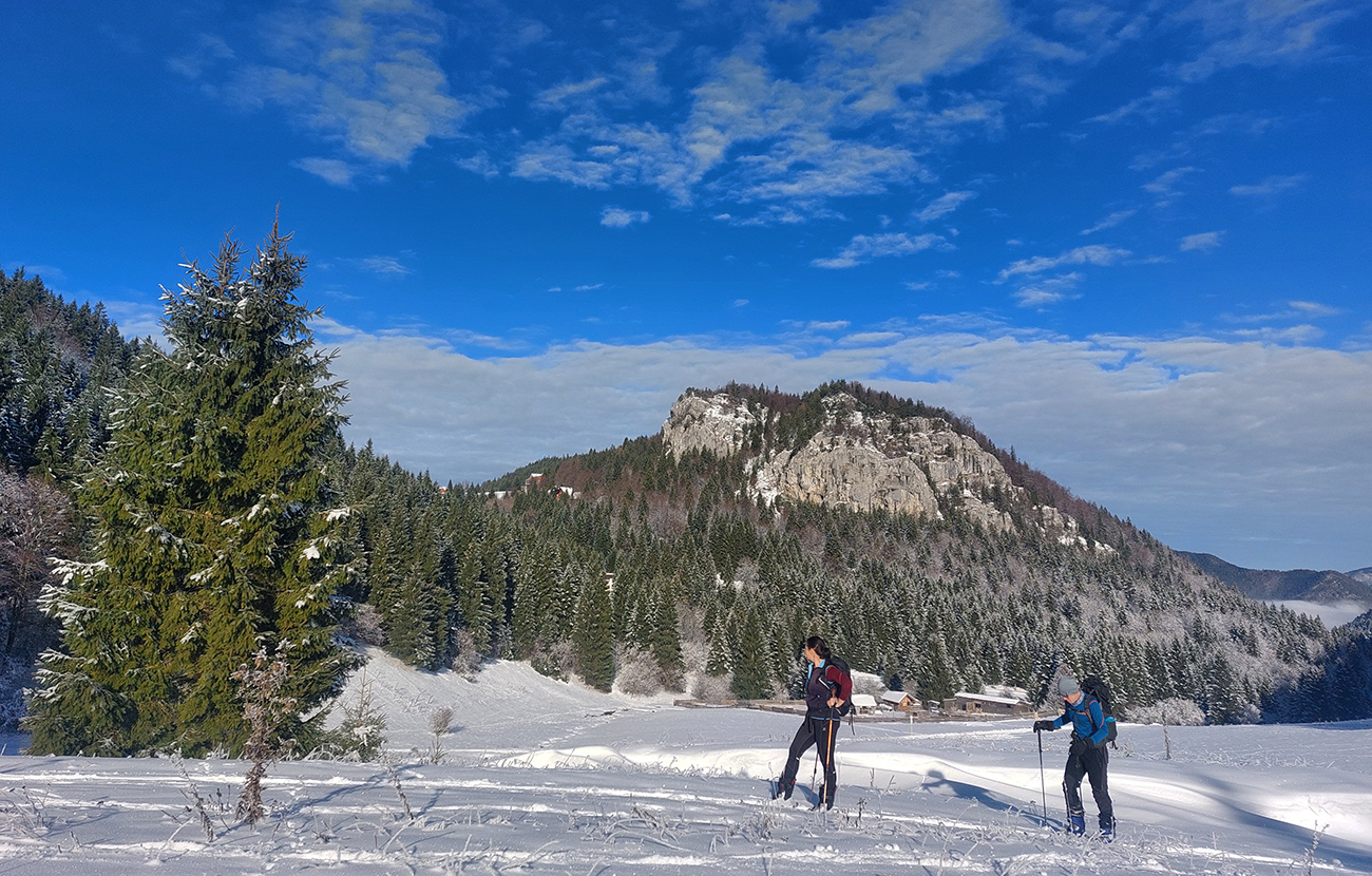 Haliny a Sidorovo na nás dohliadali pri nahadzovaní lyží na batoh, lebo po južnej stráni dole do Vlkolínca sa ani kameňačky riskovať neoplatilo. Ale zato veľkolepé výhľady na Nízke Tatry v diaľke a obielené strechy dreveníc pod nami – no čo viac si priať na rozchodenie do sezóny? Super to bolo a ďakujem modelkám za pózovanie!