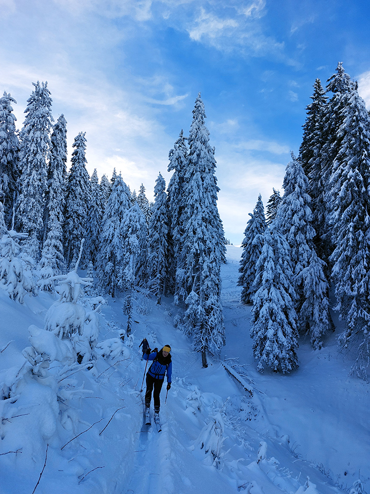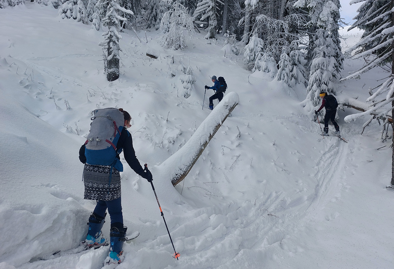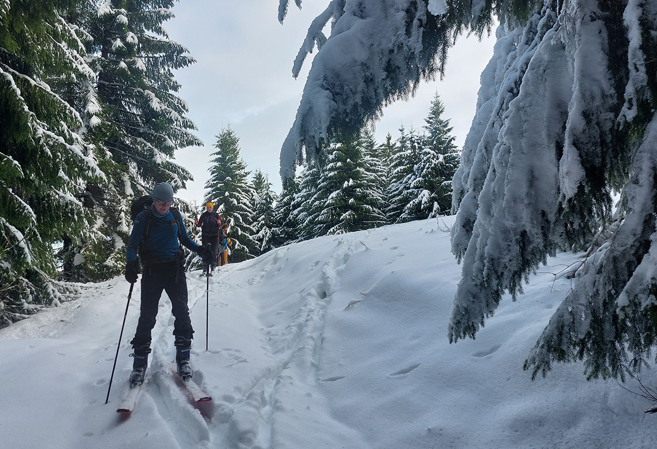Taaak davaaj po zvážnici do záveru Čutkovskej doliny, že zdola obzrieme možnosti pod Nižným Šiprúnskym sedlom. Zvážnica komfortná, stopa hlboká, vyleštená, prechod cez pramenisko bezproblémový, snehom pekne prikrytý. Len popod padnutý strom sa bolo treba lepšie zohnúť. Alebo obísť.