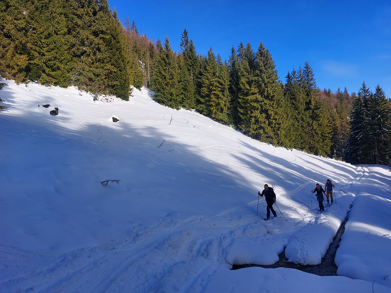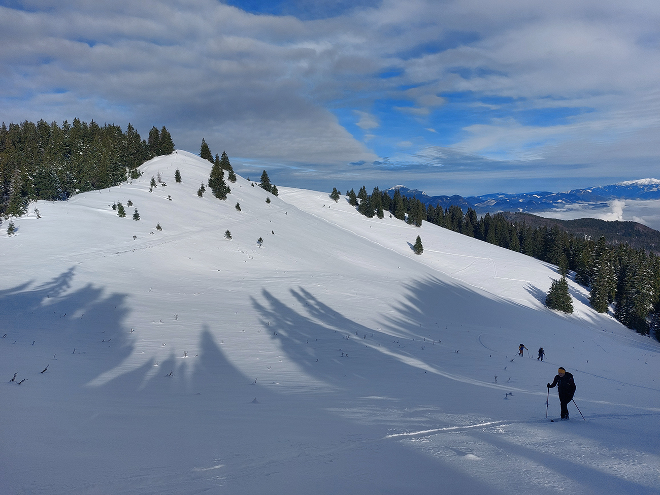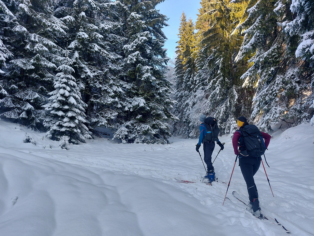 Taaak davaaj po zvážnici do záveru Čutkovskej doliny, že zdola obzrieme možnosti pod Nižným Šiprúnskym sedlom. Zvážnica komfortná, stopa hlboká, vyleštená, prechod cez pramenisko bezproblémový, snehom pekne prikrytý. Len popod padnutý strom sa bolo treba lepšie zohnúť. Alebo obísť.