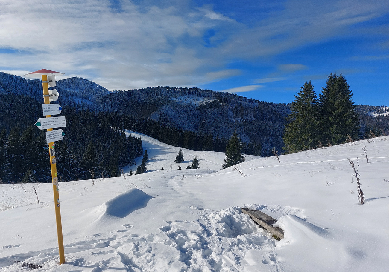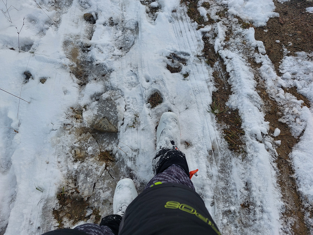 Nad dedinou do lyží! Ale do Sedla pod Sidorovom nie po značke, tá cesta je do štrku odhrnutá. Po vedľajšom chodníku komfortne, popri starom vodovode. Dole už to bude horšie, najmä v strmších miestach, k slnku otočených, vytopené miesta a žiadny podklad.