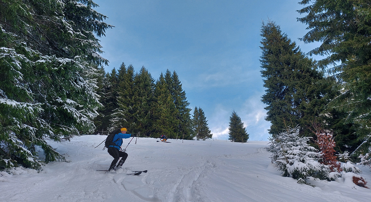 Hore Suchým Hrabovom snehu ako v polke zimy a tvrdý základ nadstavený 5-10 cenťákmi prášku. Na koniec novembra niečo nevídané! Aj keď vyššie, v traverze otočenom na juh a pod stromami bez listov už popŕchalo, ako sa slnko usilovalo. Aj pár vytopených miest pod pásmi, ale tu vyššie aj na zjazd totálny komfort.