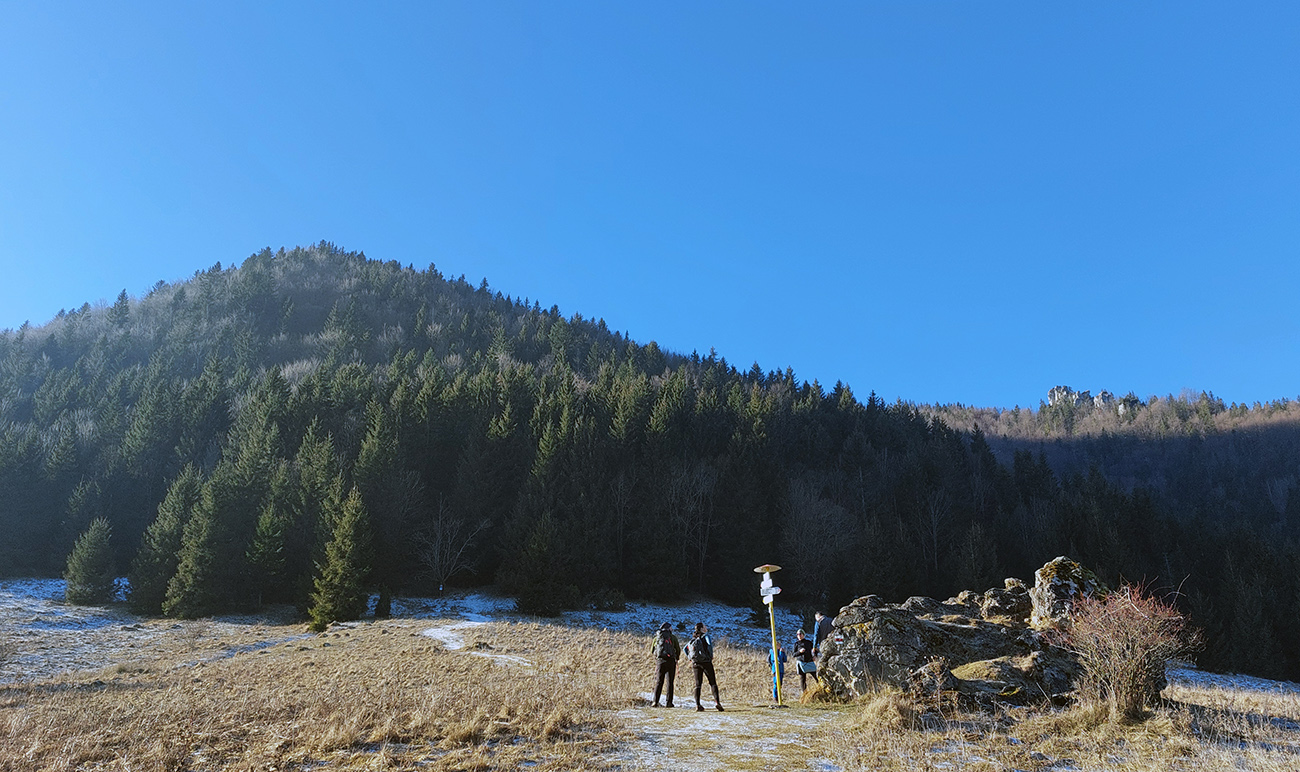 A teraz už seriózne teda... Na rozchodenie tak akurát do kopca, okolo dvoch zvoničiek nad Bielou do sedla Príslop. Po trávnatých chotárnych cestách a po ovčích prtiach, z hlbokého, mrazivého tieňa na ostré slnko. S naberaním výšky čoraz širšie panorámy: vpredu bralá pod Čapicou, vľavo Veľký Rozsutec, vpravo zalesnené dolnooravské dominanty: