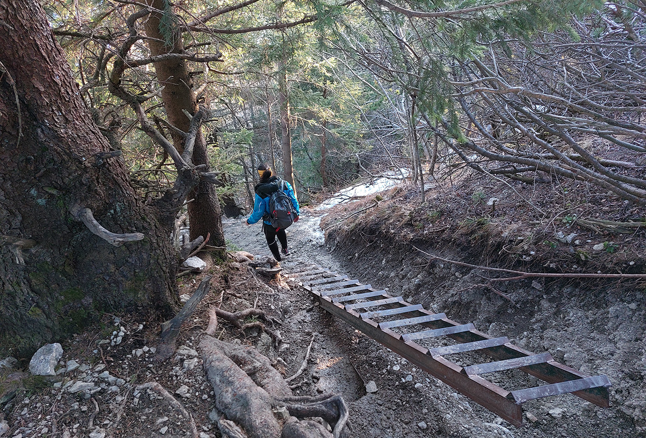 Zostup na juh je síce na viacerých tienistých miestach šmýkavý, ale bezpečnejší a istejší ako sever. Skaly suché a ľady špinavé, nižšie sa aj blato nájde. Pred očami rastie Stoh a za chrbtom brčkavý terén Rozsutca v neskorodenných pastelových farbách.