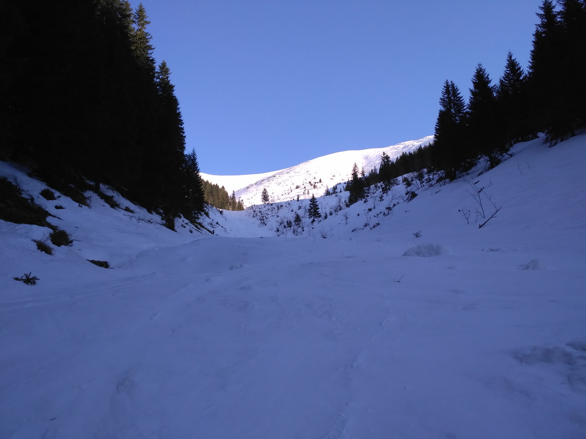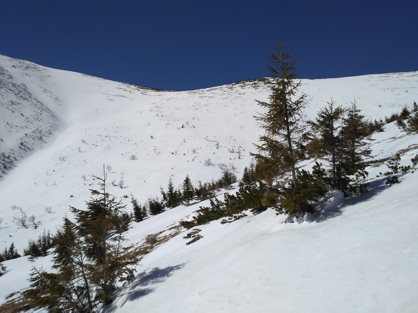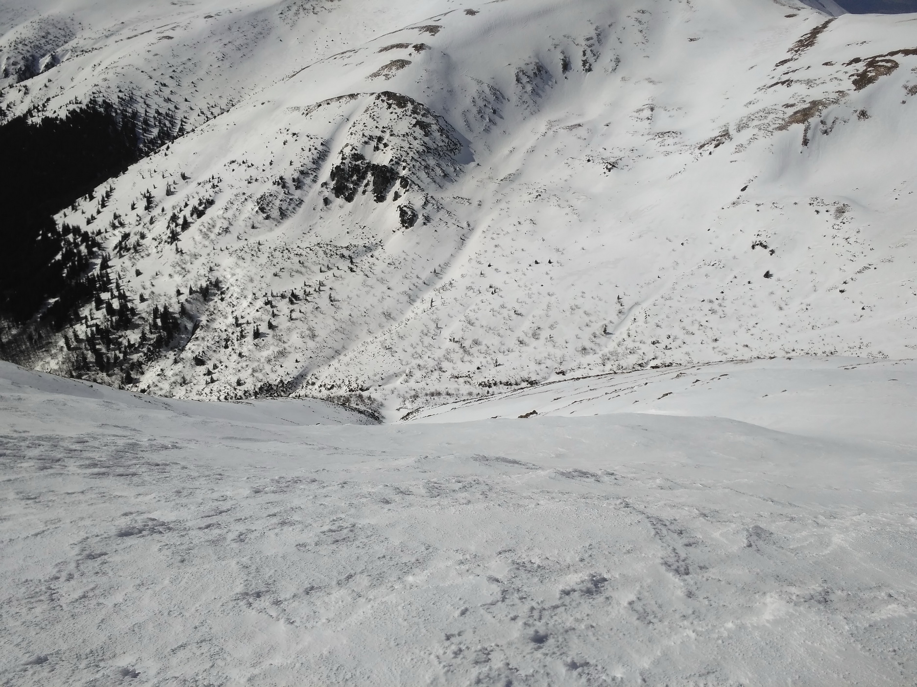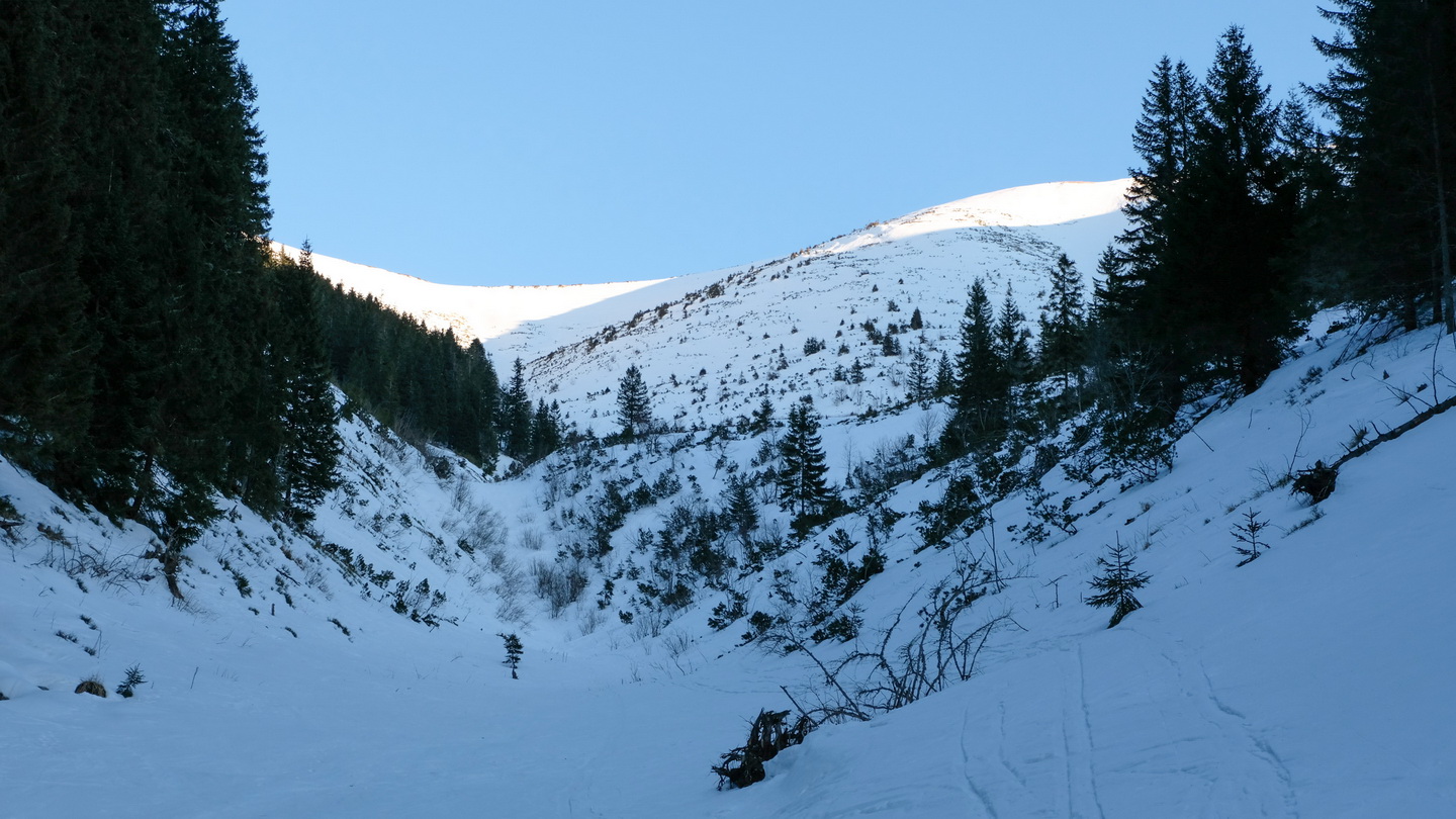 Na túru si vyberám slnečný, ale chladný deň. Potom, ako som sa tu minulý rok po dvoch teplých nociach plahočil rozmočenou kašou, nemám chuť si to zopakovať. Robím dobre? Pri výstupe hore žľabom spadajúcim zo sedla Ďurkovej som si nie úplne istý. Povrch je betónový, kde tu mapky nafúkaného nového snehu. Blížiac sa k hlavnému hrebeňu odbáčam na prvom vetvení viac vľavo do žľabu začínajúceho z miesta, kde sa k hlavnému hrebeňu pripája bočný hrebeň smeujúci k Mestskej hore (zelená značka). Tento žľab je pre výstup asi najkomfortnejší a za určitých podmienok sa dá kompletne vypásovať. Dnes tie podmienky nie sú a k záveru hádžem lyže na batoh a obúvam škrabáky. Ide sa dobre a tak po dosiahnutí hrebeňa hneď neprestrojím a testujem, do kedy ma táto neatraktívna technika bude baviť. Výsledky testu nie sú dôležité a čoskoro som na Chabenci (1955 mnm). Zlepím, zapnem a fičím juhovýchodnou expozíciou do záveru Lomnistej doliny. Nádherný priestor, ako všetko zakázané. Na pásoch v diskrétnosti podpásujem obrovskú zbernú plochu Kotlísk a zo záveru kotla v mačkách cikcakujem k vrcholu Skalky.