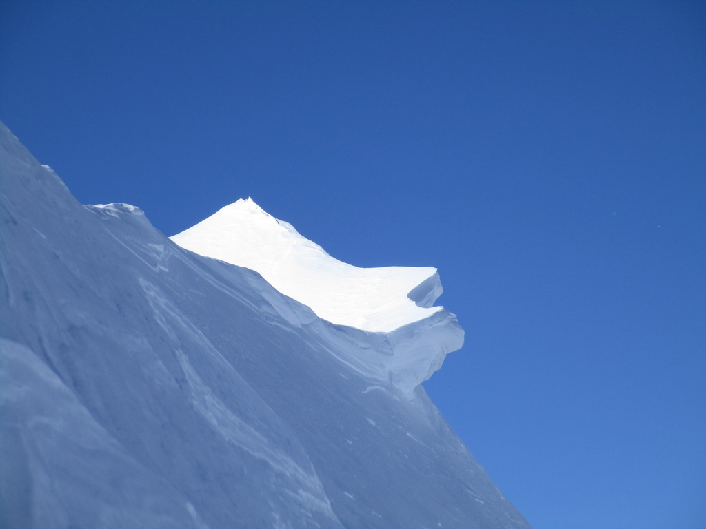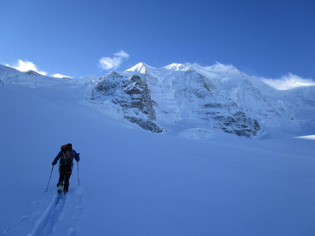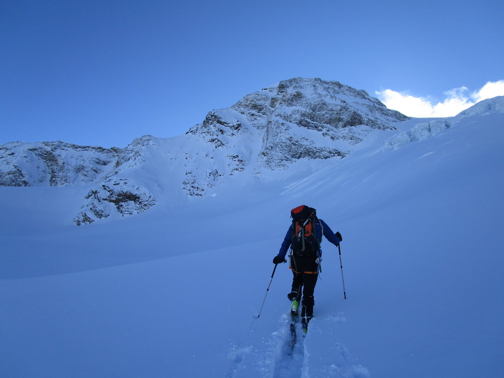 Dvíhajú sa mraky od juhu z talianskych dolín. Keď pôjdeme hore na vrchol riskujeme zjazd v zlej viditeľnosti hovorí Mauro. Mraky sa zastavujú o skalnú hradbu a náš ľadovec ostáva čistý. Poďme hore, vydrží to vravím chlapom, nerád sa otáčam kúsok pod vrcholom v takýchto podmienkach.