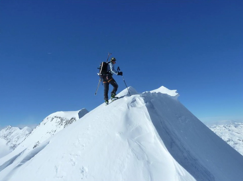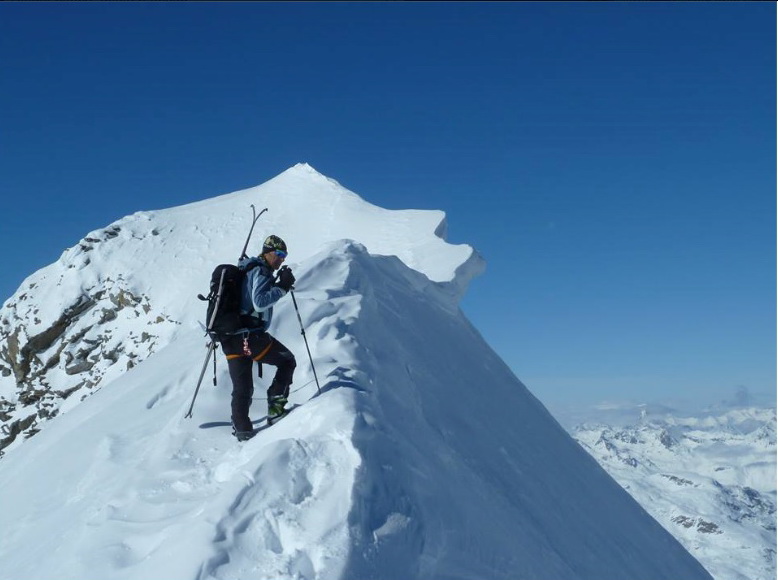 Výhľady z vrcholu sú úžasné. Robíme si navzájom fotky. Mauro lyžuje dole prvý. Cítim, že nemám tú istotu čo on. V ľadovom svahu mi to trvá kým sa odvážim na prvú otočku. Potom to už ide.