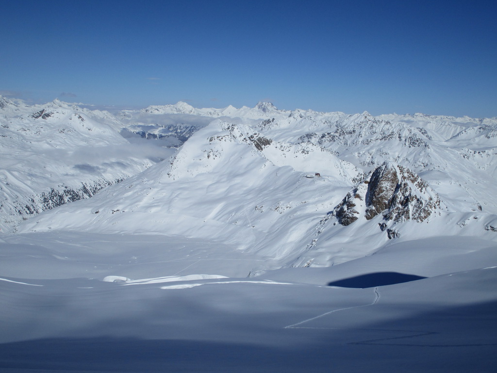 Vystupujeme hore z lanovky, po pár metroch na lyžiach zastavujeme a pozeráme si úžasný výhľad. Neveríme vlastným očiam: žiadna stopa nevedie hore. Nejaké stopy dole traverzujú ľadovec k známej frírajdovej variante Gemsfreiheit ale hore nič.