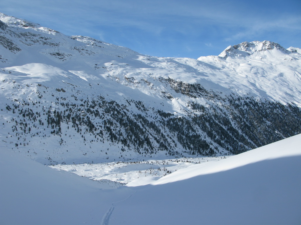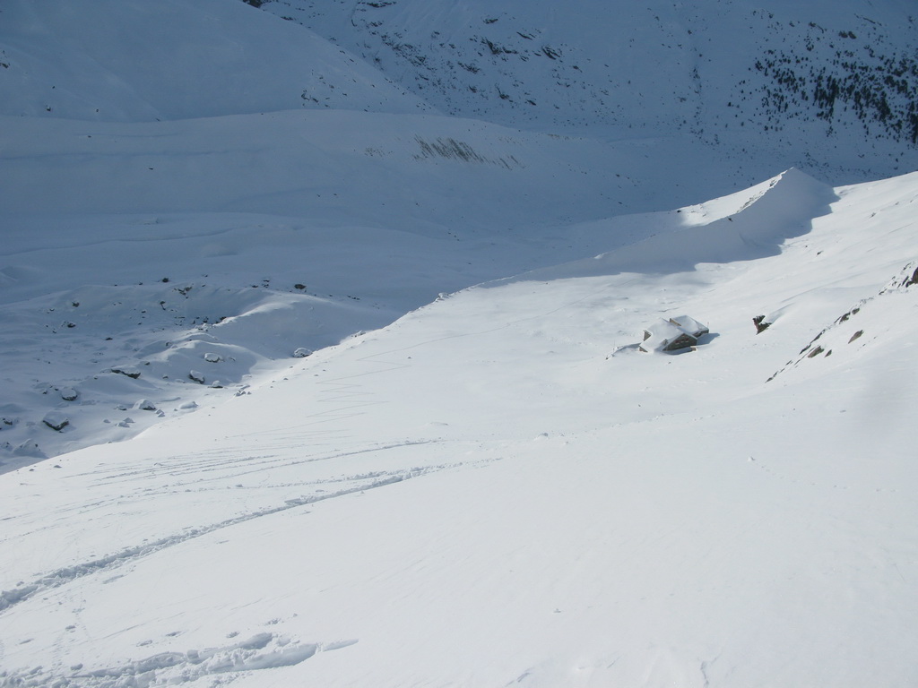 Koncom Januára sa snehová situácia stabilizovala a od posledného veľkého sneženia upokojila. Tri dni pred týmto výstupom som si prešlapal podvečer stopu nad chatu Tschierva 2584m. napriek tomu som v deň výstupu už našiel len občas kúsok stopy, ktorá nebola zafúkaná.