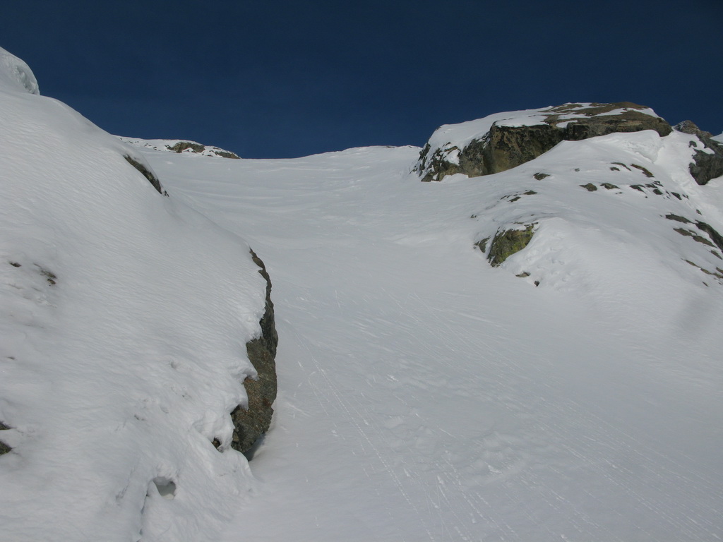 Ďalej výstup pokračuje dolinkou na úpätí Piz Tschierva 3546m. Ľadovcová moréna tu vytvorila akýsi protisvah a tak kráčam hore hlbokou brázdou, ktorá vytvára dokonalú lavínovú pascu. Pred tromi dňami som na obhliadke terénu zistil, že veľké lavíny z úbočia Tschiervy už spadli a ďalšie veľké nebezpečenstvo momentálne nehrozí.