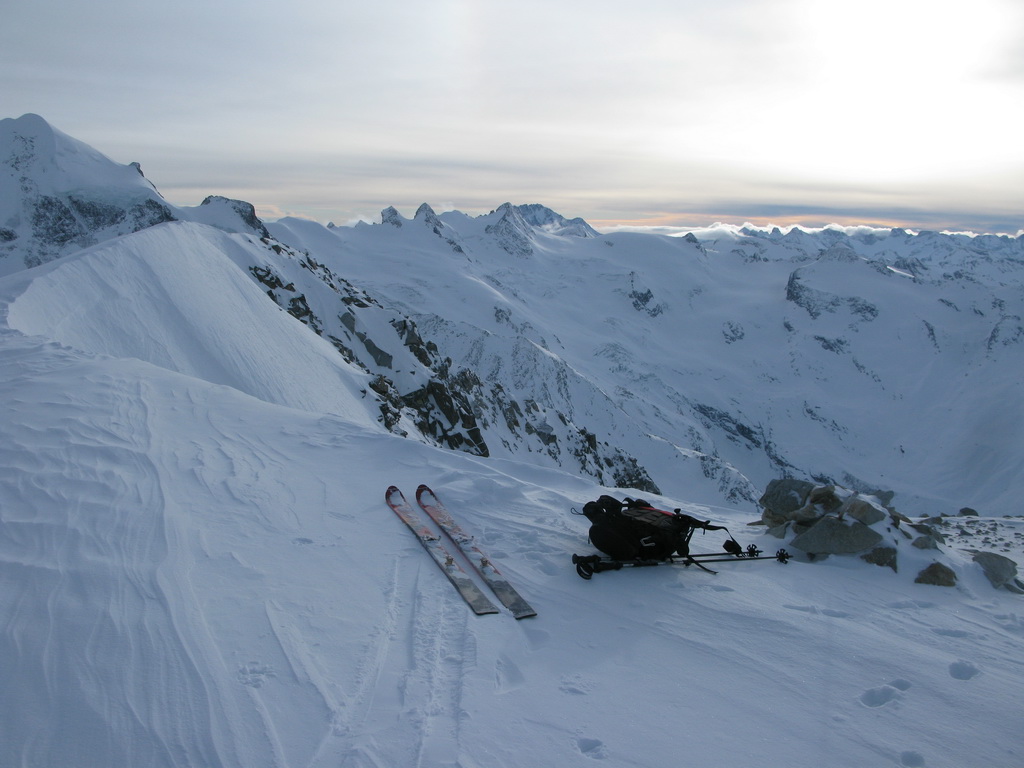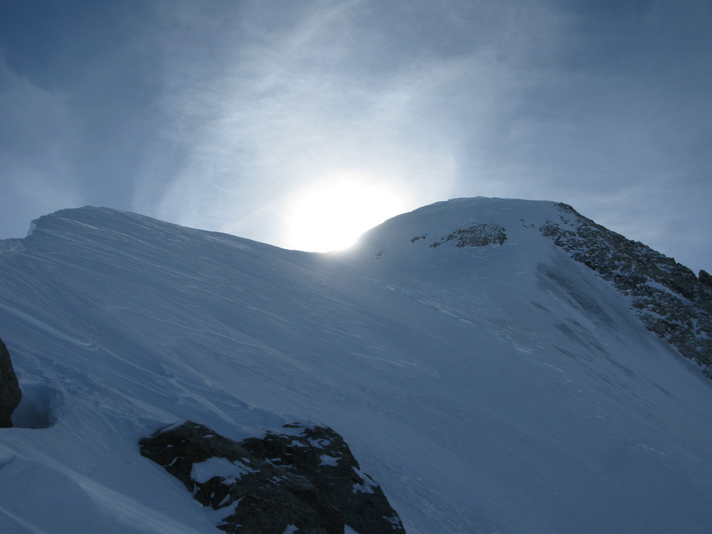 Prichádzam po ľadovci bez trhlín pod západnú stenu Morteratschu. Najprv stúpam hore na lyžiach ale záver do sedielka na hrebeni už idem v tvrdom snehu s lyžami v rukách. Je tu tvrdo a strašná zima. Rozhodujem sa nechať lyže tu a ďalej pokračujem s mačkami na nohách.