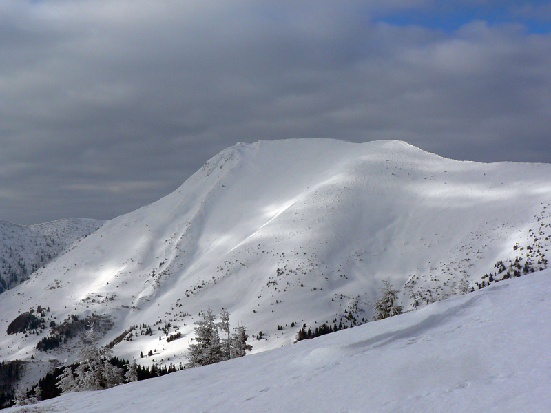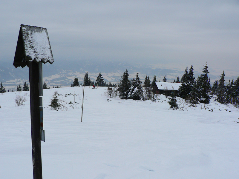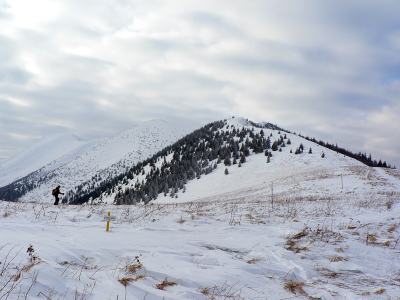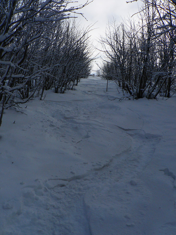Na Žobrák sa ide lesom a pekne strmo a pekne pomedzi stromy, na lyžiach nič moc, kľučkovanie, obchádzanie a ešte aj ľadová kôra pod tenkou vrstvou prašanu. Posledný úsek som musel lyže hodiť na batoh, našťastie sa to moc neborilo. No prvý jemný zjazdík na pásoch na lúku a prásk – poriadna držka dopredu. Na otvorených miestach sa totiž od začiatku striedal prašan a vetrom ubité preveje, jeden som trafil. Nič neobvyklé, len špička provizórne gumou upnutého pásu prestala lepiť. Ale ešte je pás hádam použiteľný, ide sa ďalej.