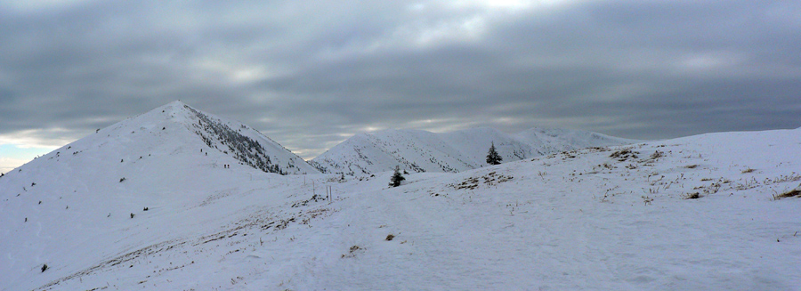 Zo sedla Stohového do sedla Snilovského ľudí ako mravcov, hlavne od Poludňového grúňa poriadne zástupy. Hrebeň vyfúkaný, našťastie nie do hladkého ľadu, šmirgeľ pod pásmi drží aj v strmých svahoch, niekde je na zemi dokonca trochu prášku. Len cítim že sem akosi nepatrím, väčšinou míňam pešiakov a snežničiarov. Pocit vrcholí, keď stretnem tetu v rifliach a s kabelkou :-)