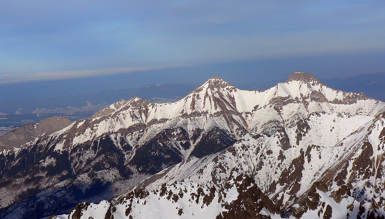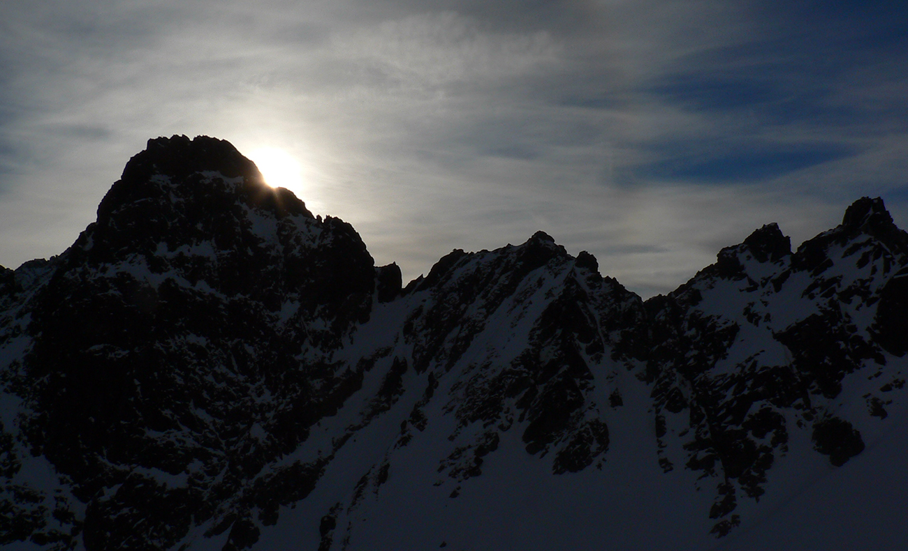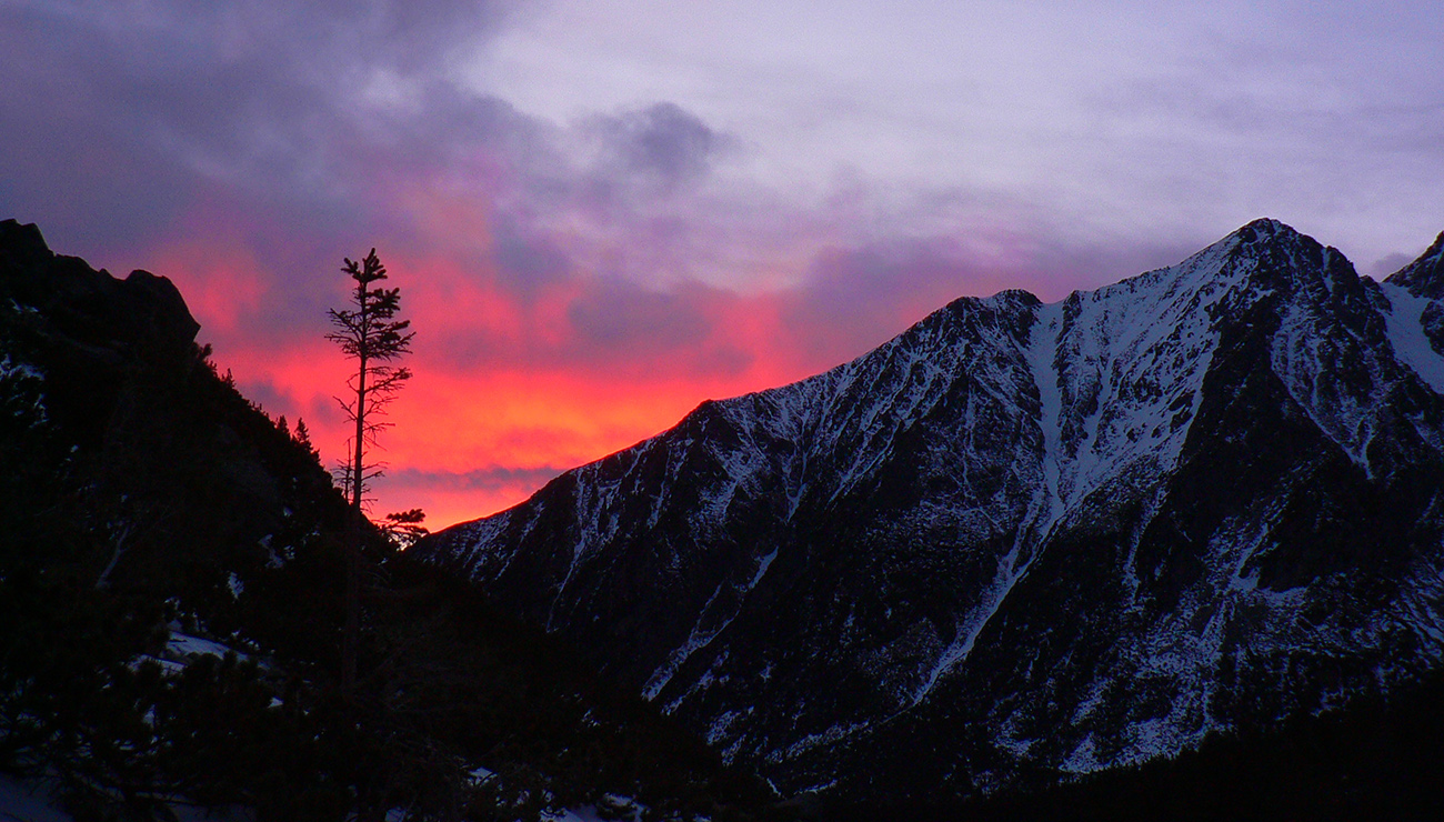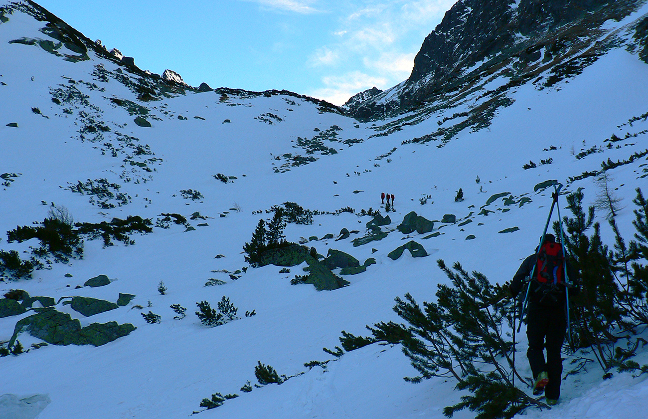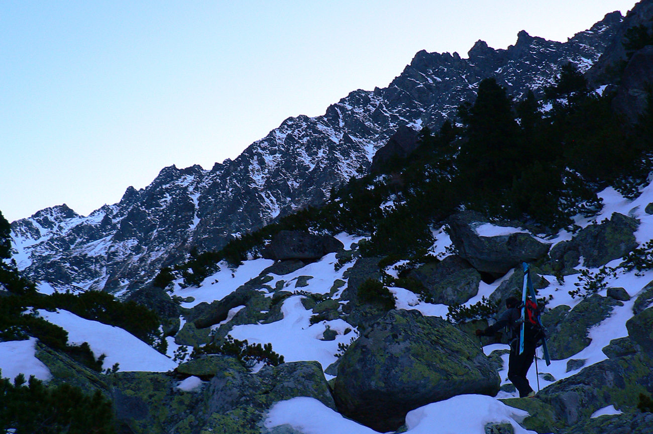 Takže ráno, už poučení (s lyžami na chrbte a nie na nohách) štrikujeme kosovkou, popri potoku, cez blokovisko, až na Roveň. Našťastie je poriadne tvrdo, tak sa neprepadávame medzi haluze, aj keď početné diery po predchodcoch sú všade. Pred nami v diaľke trojica pešiakov na mačkách, ale uhýbajú doľava, niekam smerom do Dračieho sedla. Cestou časté obzeranie, vychádzajúce slnko farbí Satana a spol. do pekelnej červene.