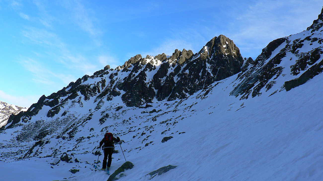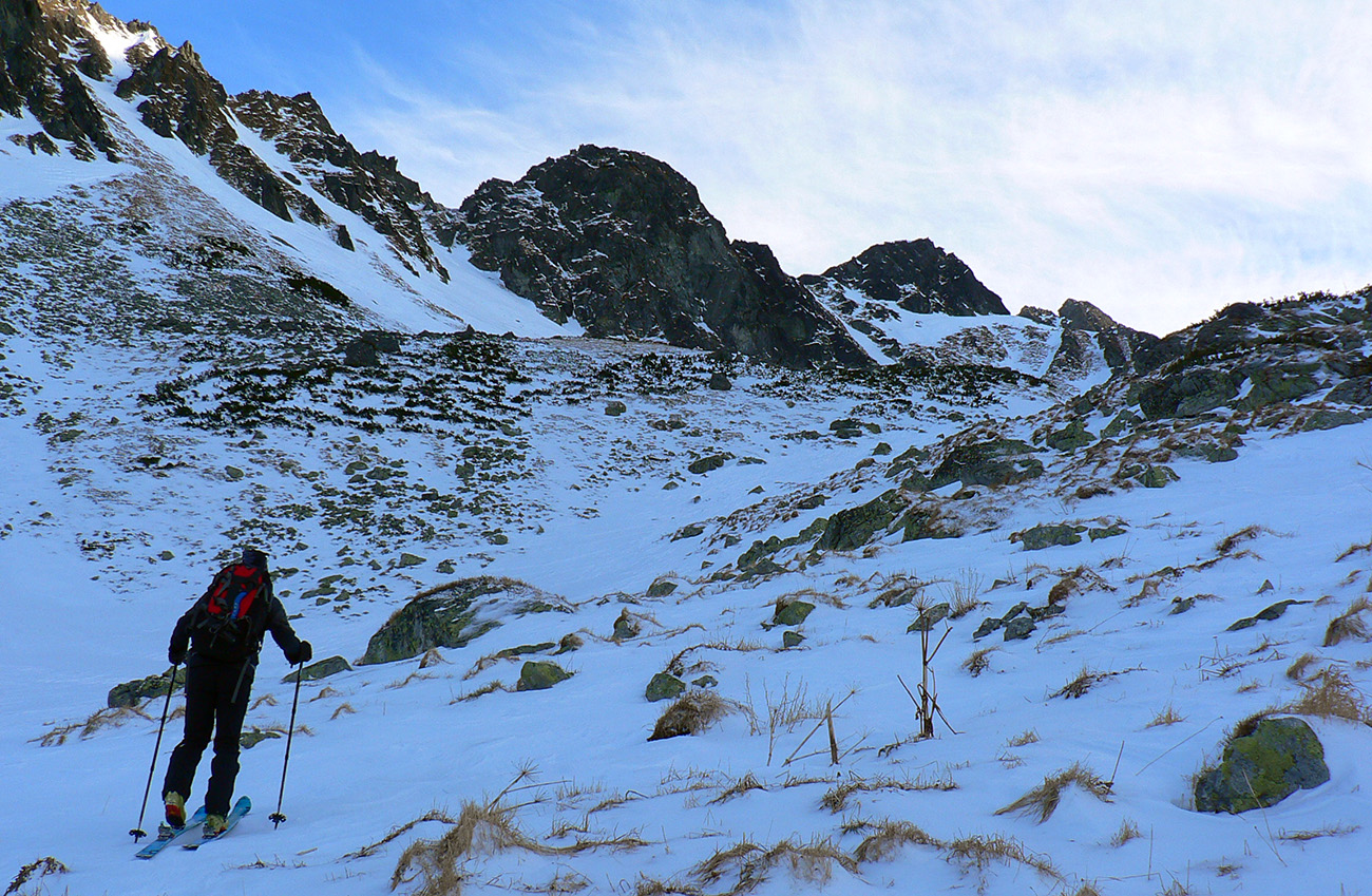 Smerujeme z Rovne pod Železnú bránu, už na pásoch. Podklad nie je klzký ľad, ale betónový šmirgeľ, ktorý suprovo drží lyže. Dá sa preto vyliezť kolmo hore aj strmý sklon na konci Rovne. Popod steny nad Ľadovým plesom už ale ideme aj na haršajzniach, lebo v strmých traverzoch za nami stopa neostáva, lyžu nezasekneme. Zato štrikovania pomedzi šutre si užívame do sýtosti. Záver do Železnej brány je samozrejme tiež tvrdý, lyže na hrb! Ale mačky netreba, nie je to šmykľavé, aj schodíky sú. A keď nie sú, vykopeme si, teplota len málo pod nulou.
