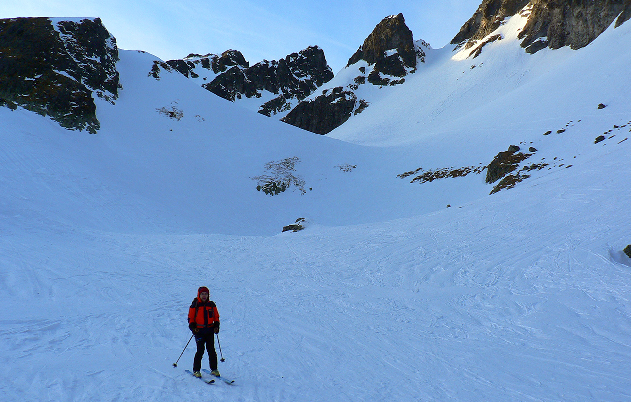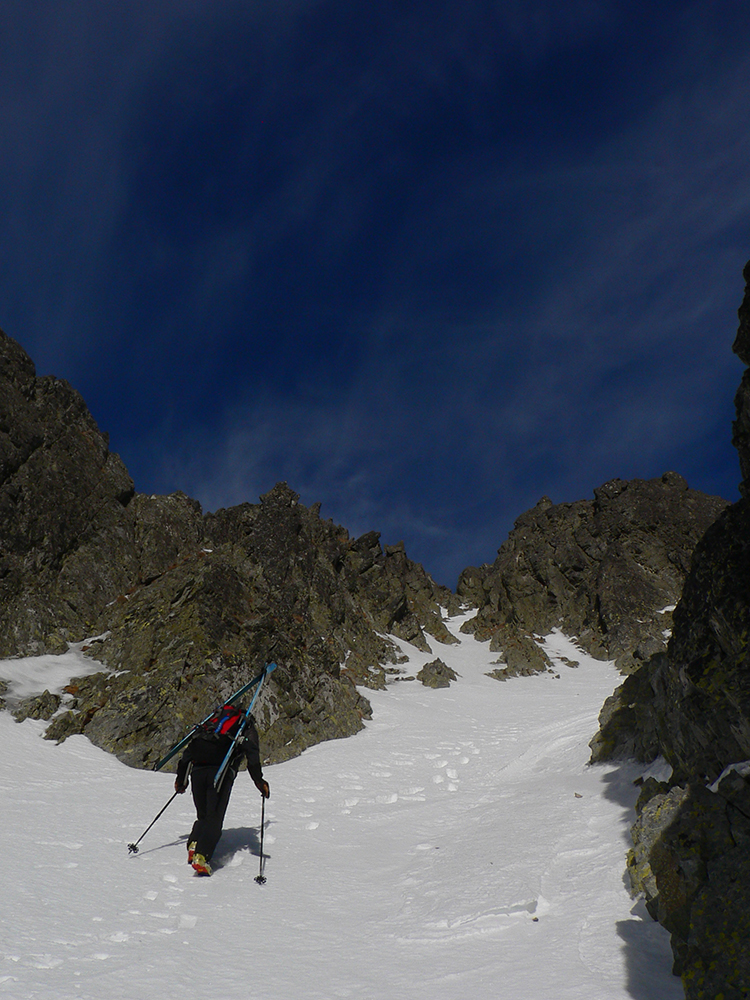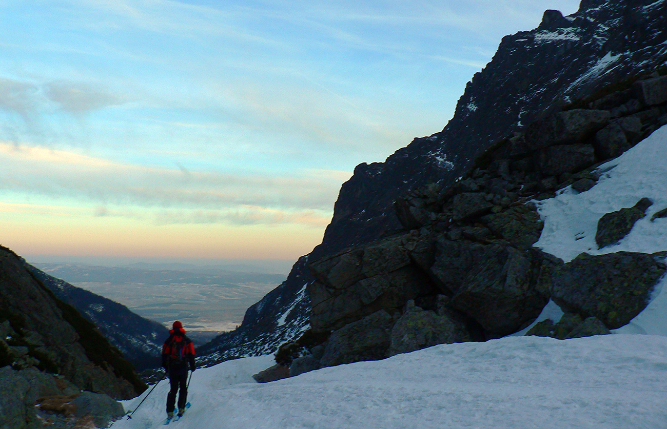 Neteší ale veľmi ten pohľad na druhú stranu: prvých pár metrov sa to nepríjemne leskne, aj keď sme v tieni. Našťastie je to ale dosť hrboľaté, dá sa do toho oprieť lyža. Potom už komfortný náfuk vetrom ubitého snehu a lyžovačka až po Gerlachovské spády čím nižšie, tým lepšia. Nie ľad, ale sneh, len miestami sú v ňom vyfúkané poriadne výmole.