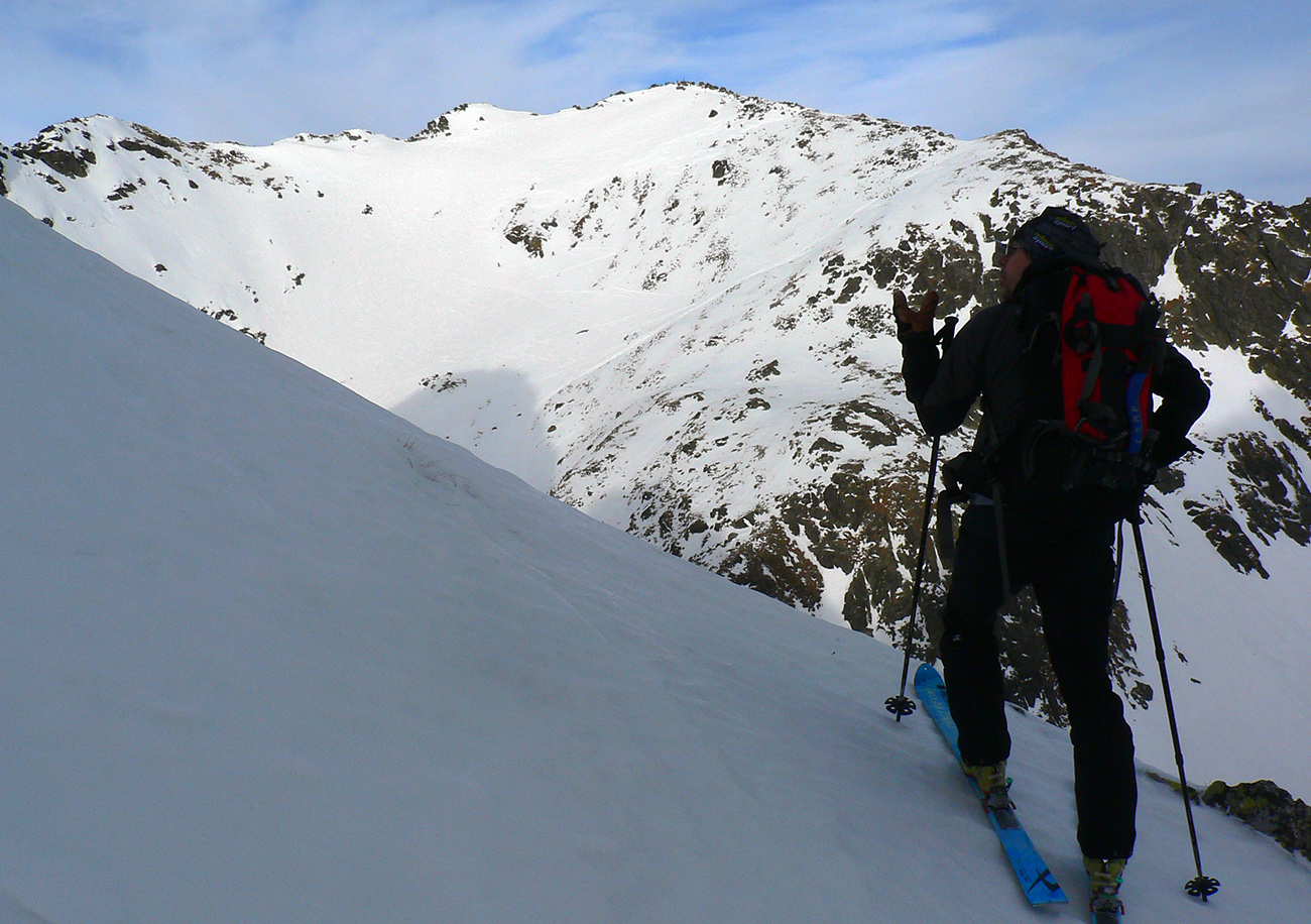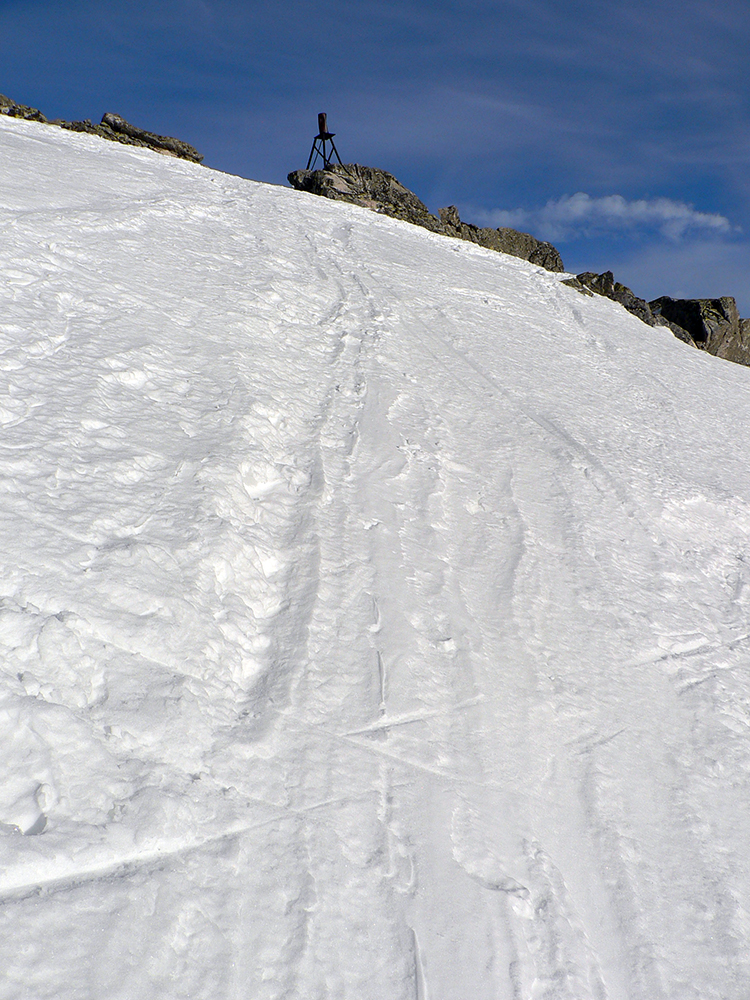 Onedlho teda už cikcakujeme hore k vrcholovej hrdzavej veži, ale nie je to natopené ako sme si mysleli. Pod vrchom treba opatrne, aj lyžu miestami poriadne zaseknúť, tu už je ľadovo. Aj keď slnko bije do svahu, teplota je už pod nulou, nie ako v piatok. Napriek tomu za odmenu celkom dobrá lyžovačka, len už trochu hrkotavejšia ako z Prielomu. Všetky malé a nepríjemné hrbolčeky sú dávno zbrúsené masami, tak to veľmi netrasie nohami.