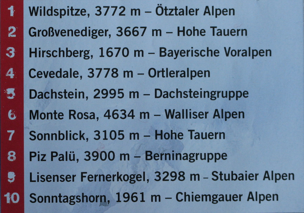 Prehľad desiatich najobľúbenejších vám tu teraz predstavíme. Popri kopcoch známych sa tu objavilo aj niekoľko menej známych mien. Do úvahy treba brať, že čitatelia časopisu Alpin pochádzajú predovšetkým z nemecky hovoriacich krajín. Nasledujúce informácie však môžu v každom prípade poslúžiť ako inšpirácia na zaujímavú túru.
