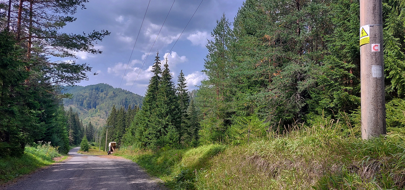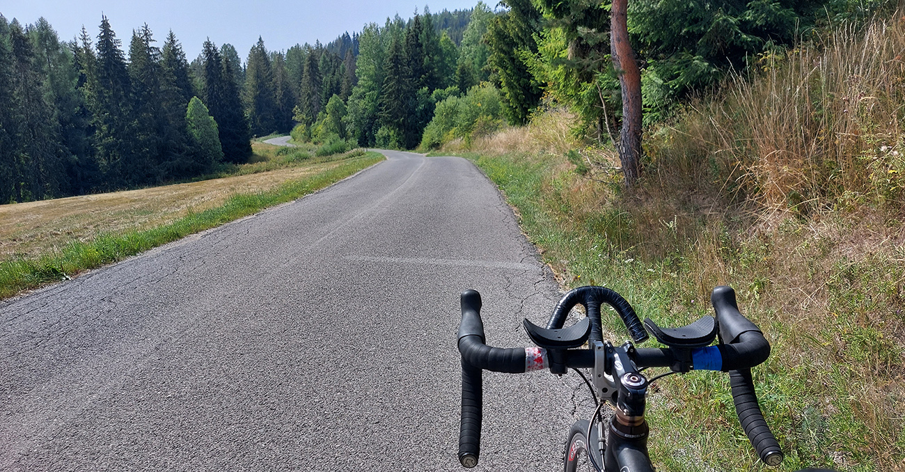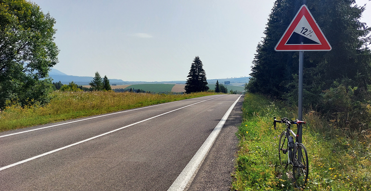 Krajina sa radikálne mení, les sa tlačí stále bližšie k ceste, konečne. Lebo vpredu sa dvíhajú čoraz nepríjemnejšie percentá. Našťastie je stúpanie nepravidelné a tie najstrmšie zalamováky sú v tieni.