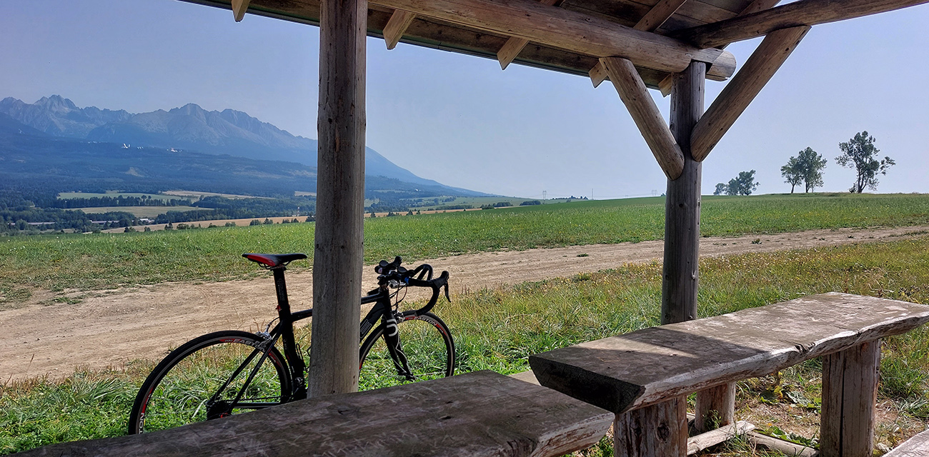 Až vo Važci sa teda od „osemnástky“ na dlhšie odliepam a valím na Štrbu. Bočná cesta – hneď je asfalt akýsi hladší :-) A výhľady sa rozširujú, lebo poriadne stúpam. Vlastne až na takmer najvyšší bod trasy, na Štrbský prah. Alebo rozhranie Liptova a Spiša (a okresov LM/PP), alebo hlavné slovenské rozvodie (Čierneho a Baltského mora), ako kto chce. Skoro hore je pri ceste symbolický prístrešok a Tatry ako na dlani, samozrejme: