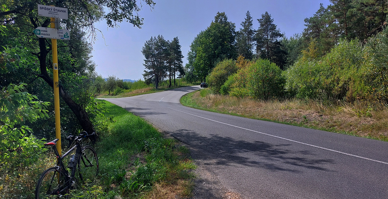 V meste dávam dlhšiu pauzu v príjemnej spoločnosti (Asi trochu úžas, čo tu chcem, že?), prvá dnešná kofča len zasyčí a rozhodujem sa, či to nazad na západ otočím cez Kubachy, alebo zájdem až do Štiavnika. Času dosť, tak vyhráva dlhší obchvat celých Kozích chrbtov. Tak zase na chvíľu po osemnástke: tu za mestom je hlučnejšia, ale v Kišovciach doprava a hneď je pokoj. O chvíľu som na najvýchodnejšom bode dnešnej trasy: