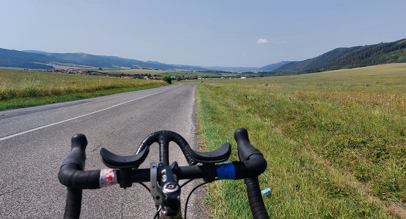 Teplota v LM síce o pár stupňov príjemnejšia ako u nás doma (a to nie je veľký výškový rozdiel), ale pohľad hore, na bielu oblohu a zákalom rozostrené slnko napovedá, že to bude poriadne horúci deň. Našťastie tesne pred frontom, južný vietor hádam bude dochladzovať... Tak sa premotávam centrom mesta a na jeho konci sa priliepam k bielej krajnici cesty I/18, smer Hrádok. A klasicky líham do predstavcov, nech tento úsek čím skôr opustím. Lebo v mojom smere je síce voľnejšie, ale oproti všetci valia do roboty a čo sa najviac divím, že vidím aj autá, ktoré by som čakal na diaľnici... Za Hrádkom našťastie cesta tíchne.