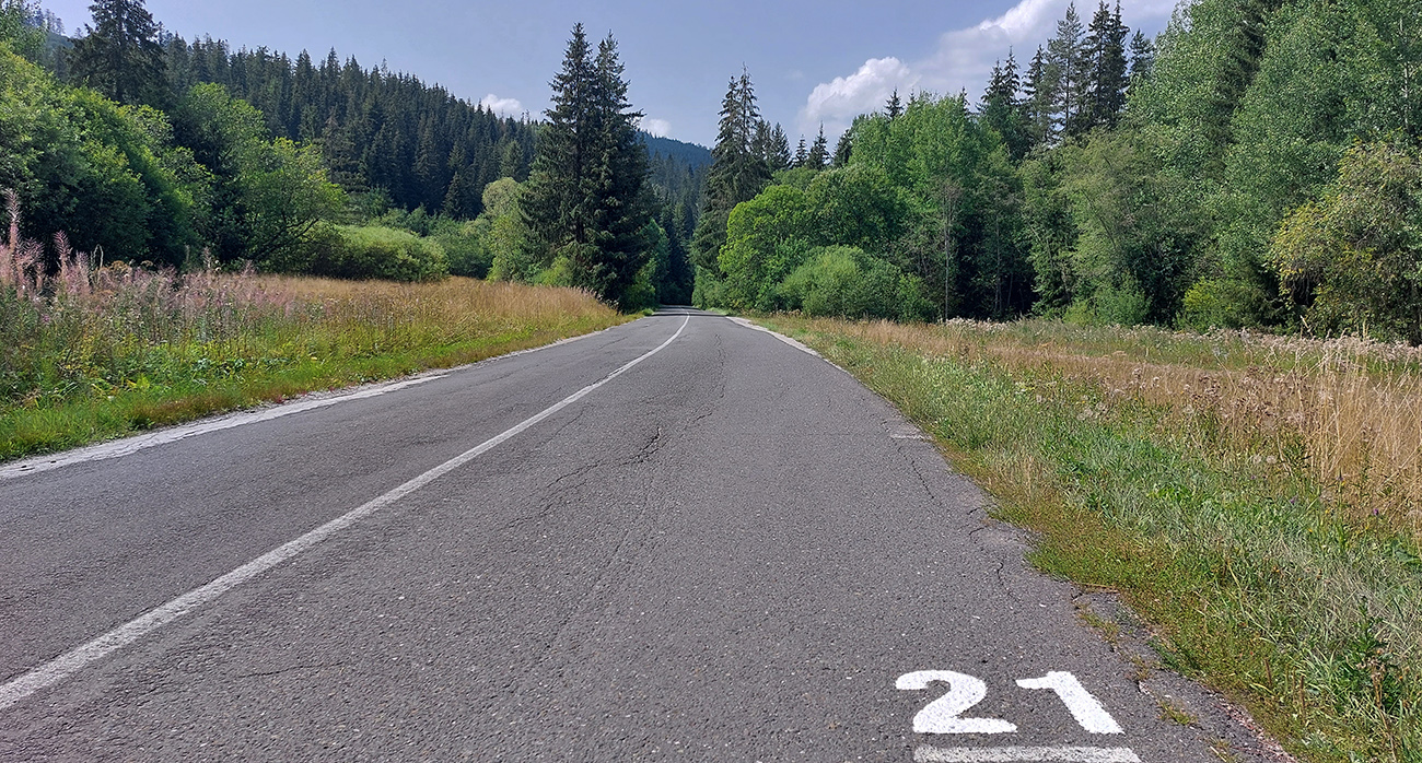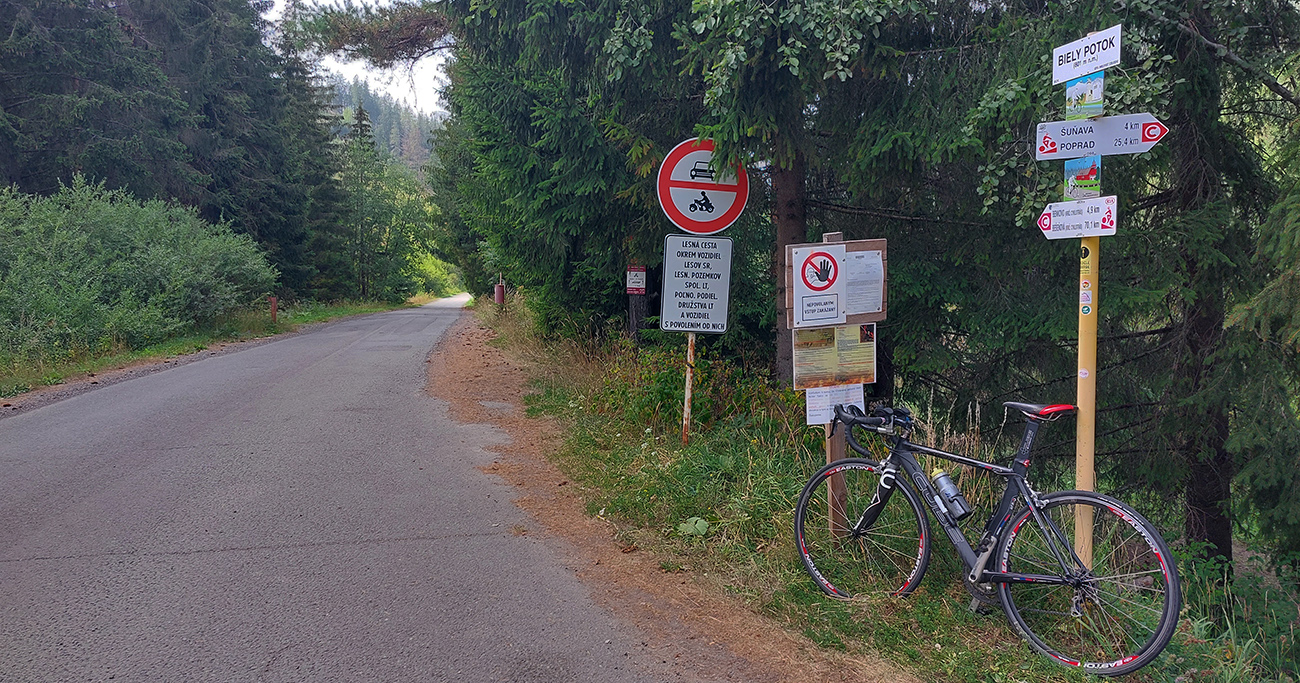 Nad Tepličkou som míňal kadejaké ružové značky a šípky, asi z minulotýždňového mtb maratónu Horal, pod Tepličkou fičím popri kilometrovníkoch júlového bežeckého Malého Štrbského Maratónu. Dolina príjemná, ihličnatá (až na tie vyholené svahy okolo), tieňa veľa a na slnku konečne mrak. Asfalt zubatý a zaplátaný, ale dá sa, len treba na výtlky trochu striehnuť.